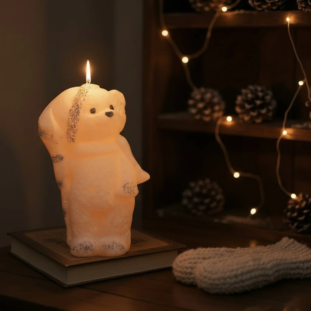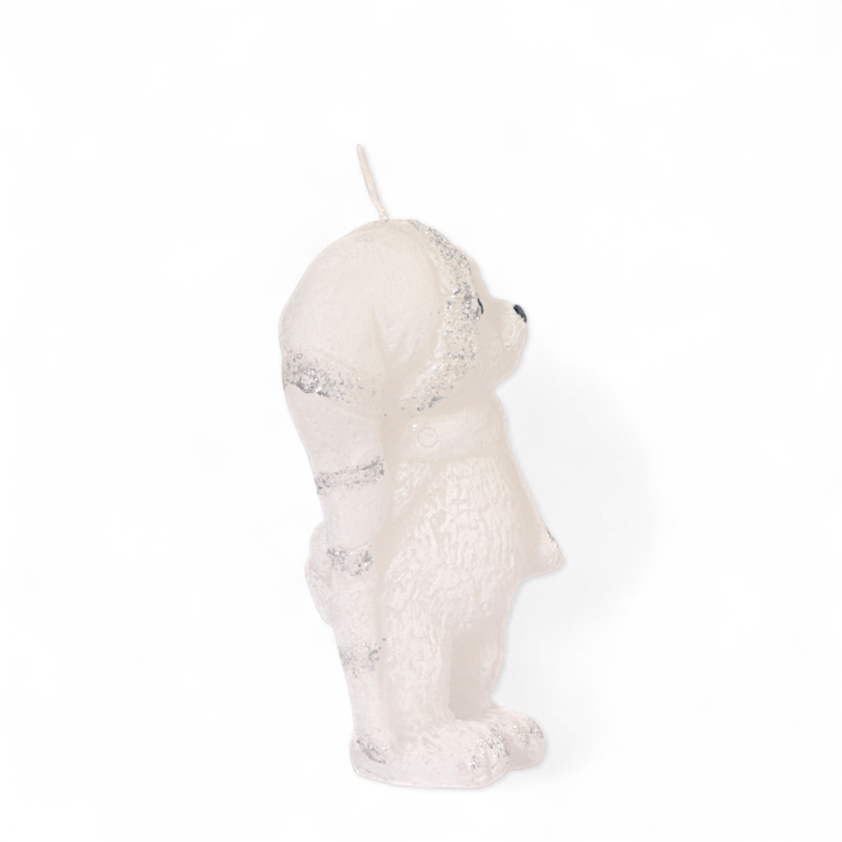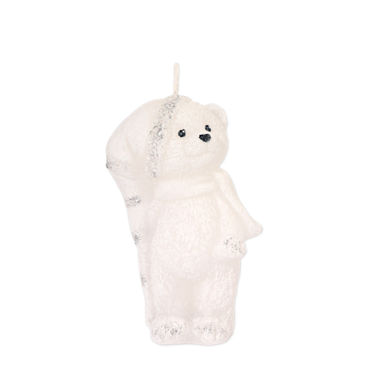 Świeczka świąteczna do stroika lub szkła dekoracyjnego. Figurka w kształcie biało-srebrnego misia o wysokości 14cm, ozdobiona brokatem. Parafinowa świeca, idealnie nadaje się na element dekoracyjny wianka lub stroika. Świetnie sprawdzi się również jako upominek lub dodatek do prezentu.