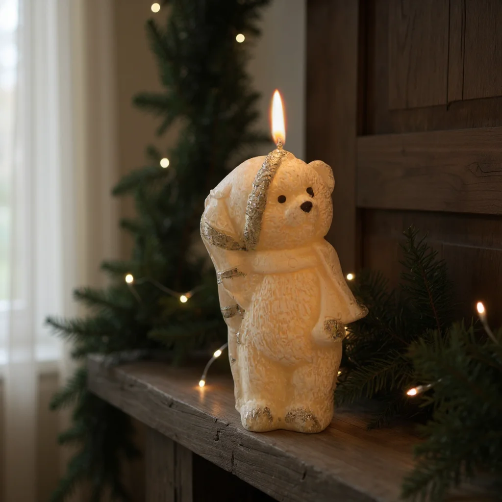 Świeczka figurka do świątecznego stroika. Dekoracyjna świeczka w kształcie misia w kremowym kolorze, dodatkowo ozdobiona złotym brokatem. Parafinowa świeca o wysokości 14cm, idealnie nadaje się na element dekoracyjny wianka lub stroika. Świetnie sprawdzi się również jako upominek lub dodatek do prezentu.