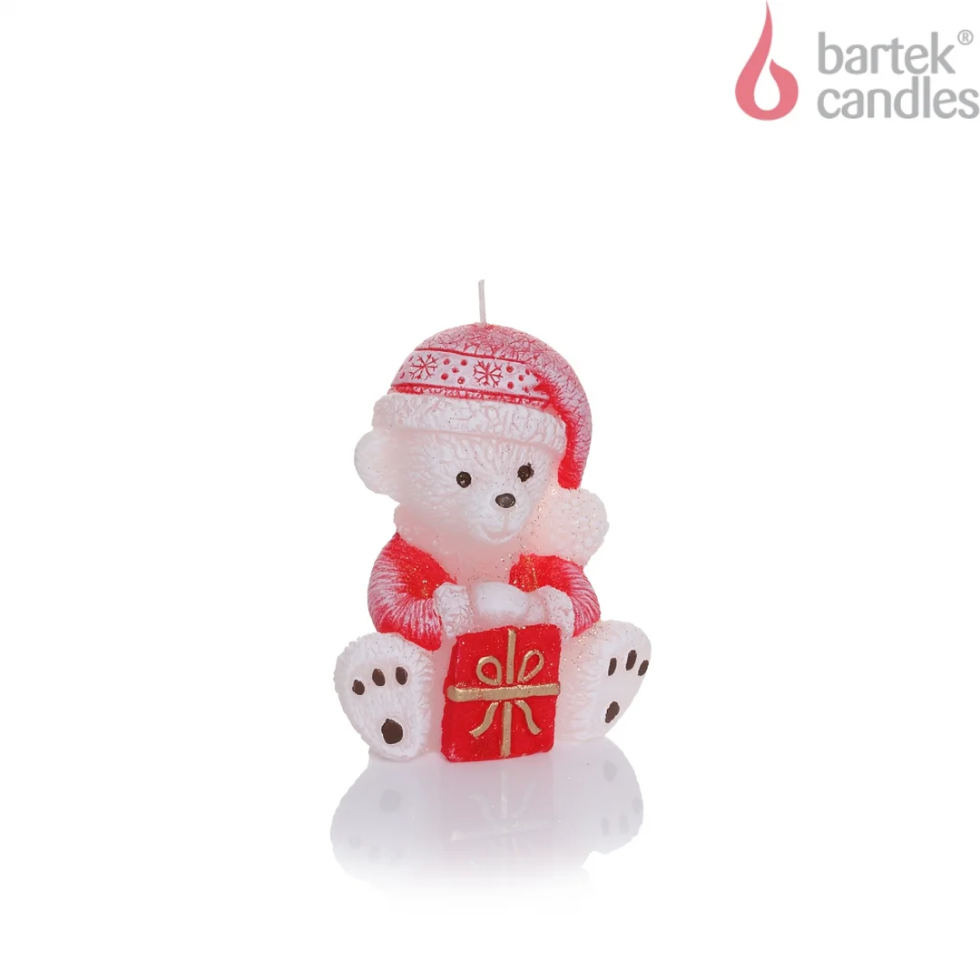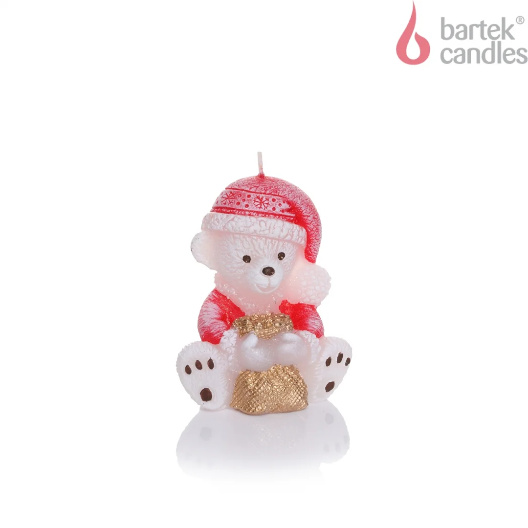 Zimowa, świeczka świąteczna z kolekcji Winter Teddy Bear. Świeczka figurka o wysokości 8cm, dostępna w dwóch wariantach do wyboru: miś z czerwonym prezentem oraz miś ze złotym workiem. Ręcznie wykonana świeczka o czasie spalania do 4 godzin, z delikatnym świątecznym, owocowo-korzennym aromatem. Idealnie nadaje się na element dekoracyjny wianka lub stroika. Świetnie sprawdzi się również jako upominek lub dodatek do prezentu.
