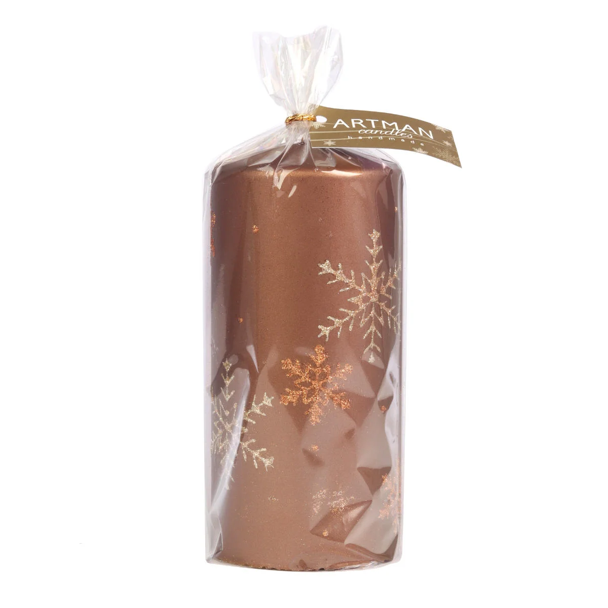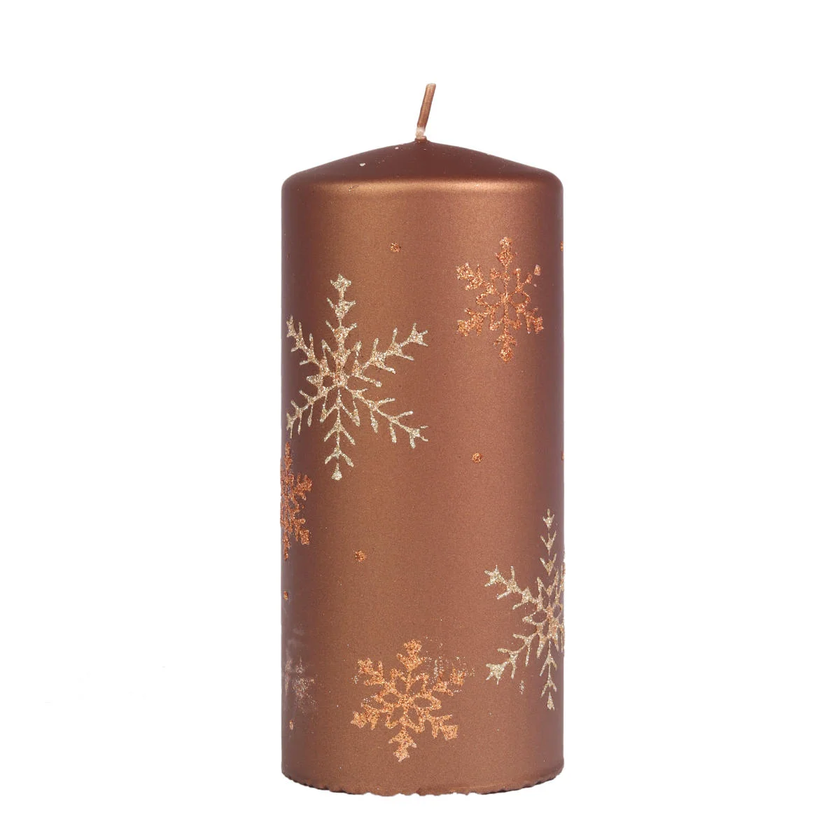Brązowa, duża świeca dekoracyjna z kolekcji Frost. Świeca walec o czasie palenia do ok. 112 godzin, wykonana z parafiny, ozdobiona złotymi i miedzianymi śnieżynkami i delikatnie obsypana brokatem. Świeca jest bezwonna, idealnie sprawdzi się jako dekoracja do lampionu, świecznika, jako element stroika lub upominek czy dodatek do prezentu.