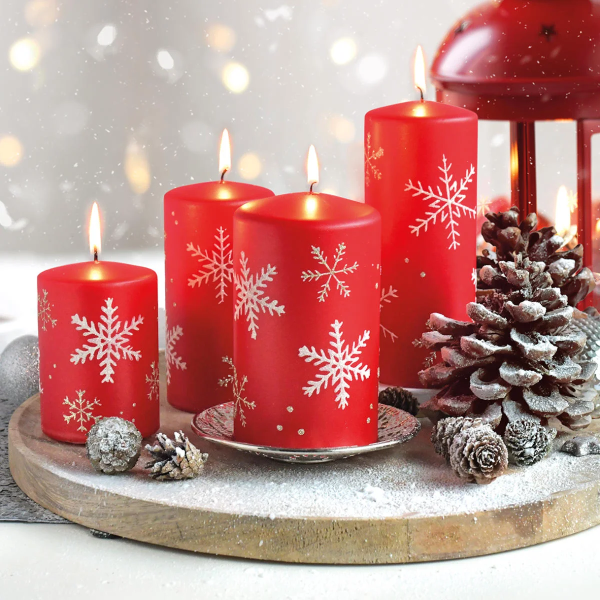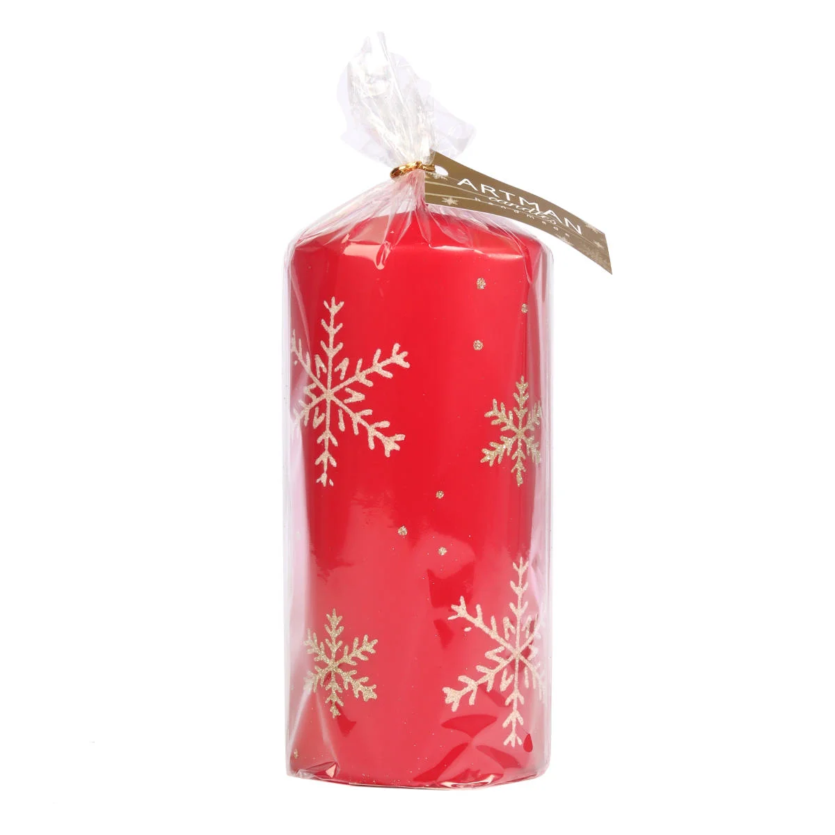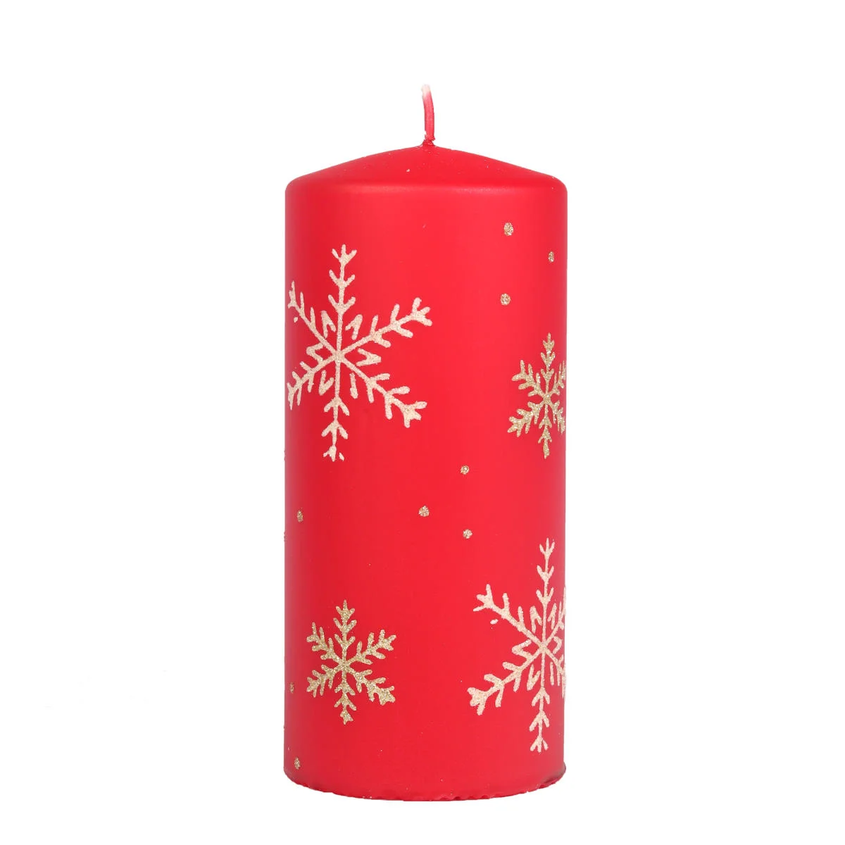 Czerwona, duża świeca dekoracyjna z kolekcji Frost. Świeca walec o czasie palenia do ok. 112 godzin, wykonana z parafiny, ozdobiona białymi i złotymi śnieżynkami i delikatnie obsypana brokatem. Świeca jest bezwonna, idealnie sprawdzi się jako dekoracja do lampionu, świecznika, jako element stroika lub upominek czy dodatek do prezentu.