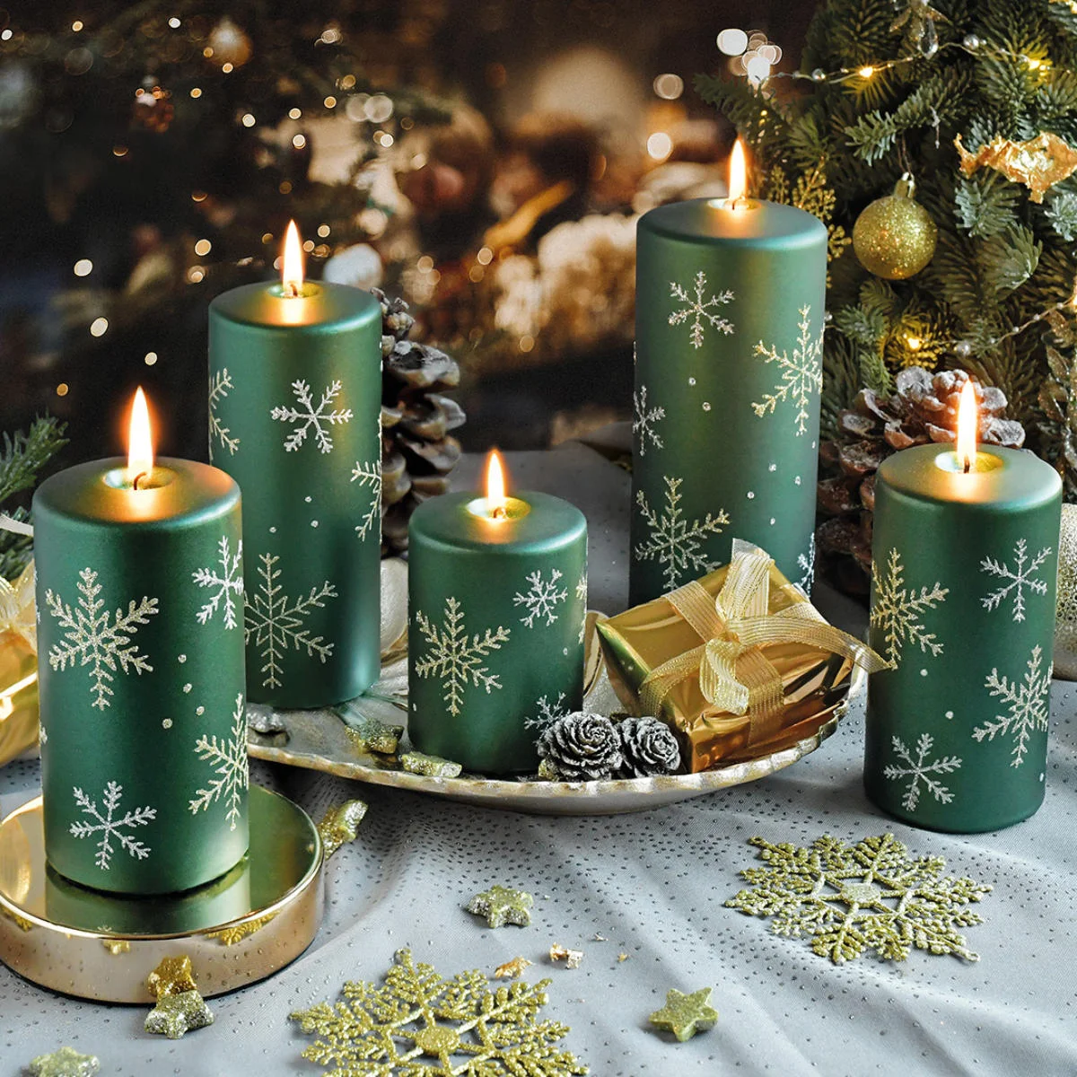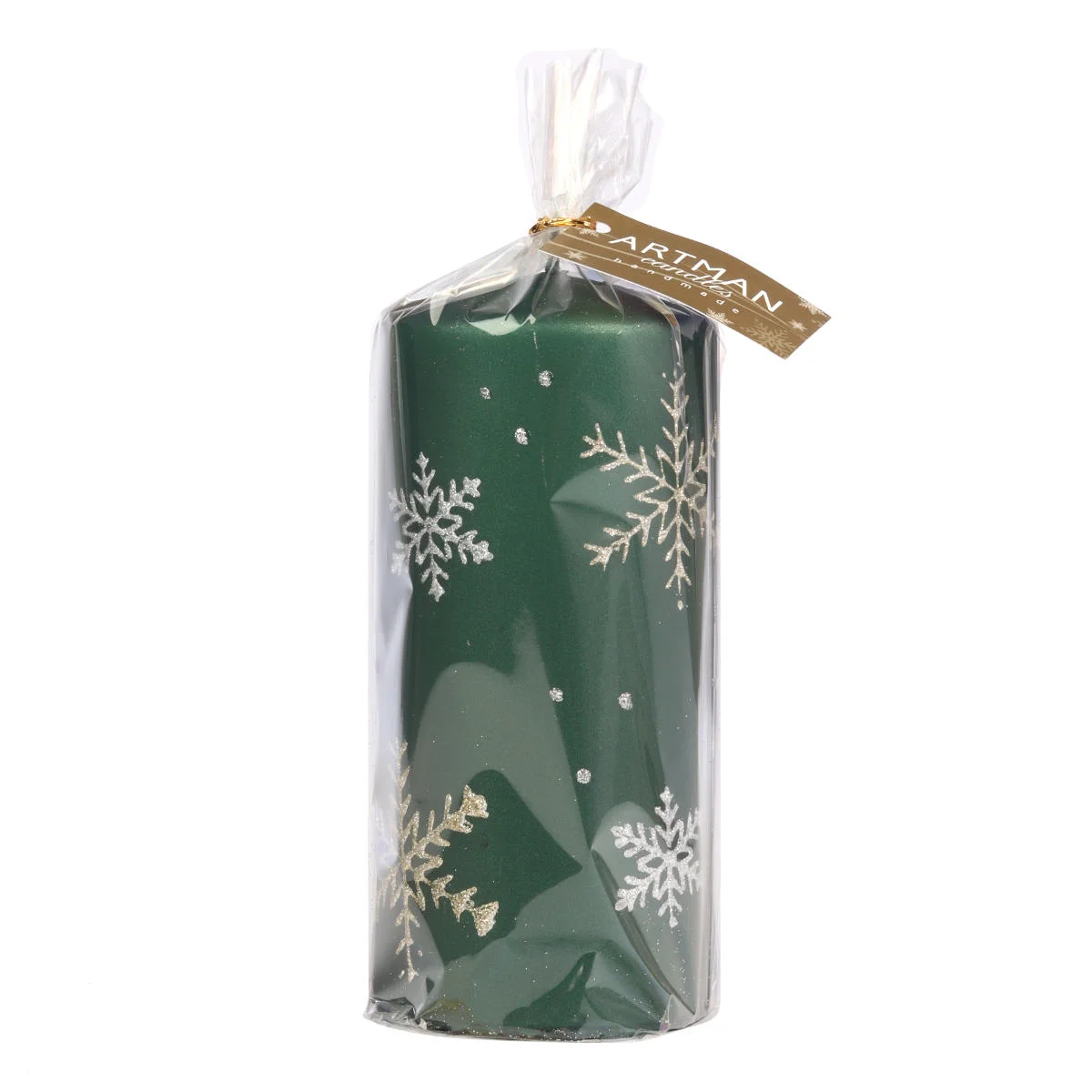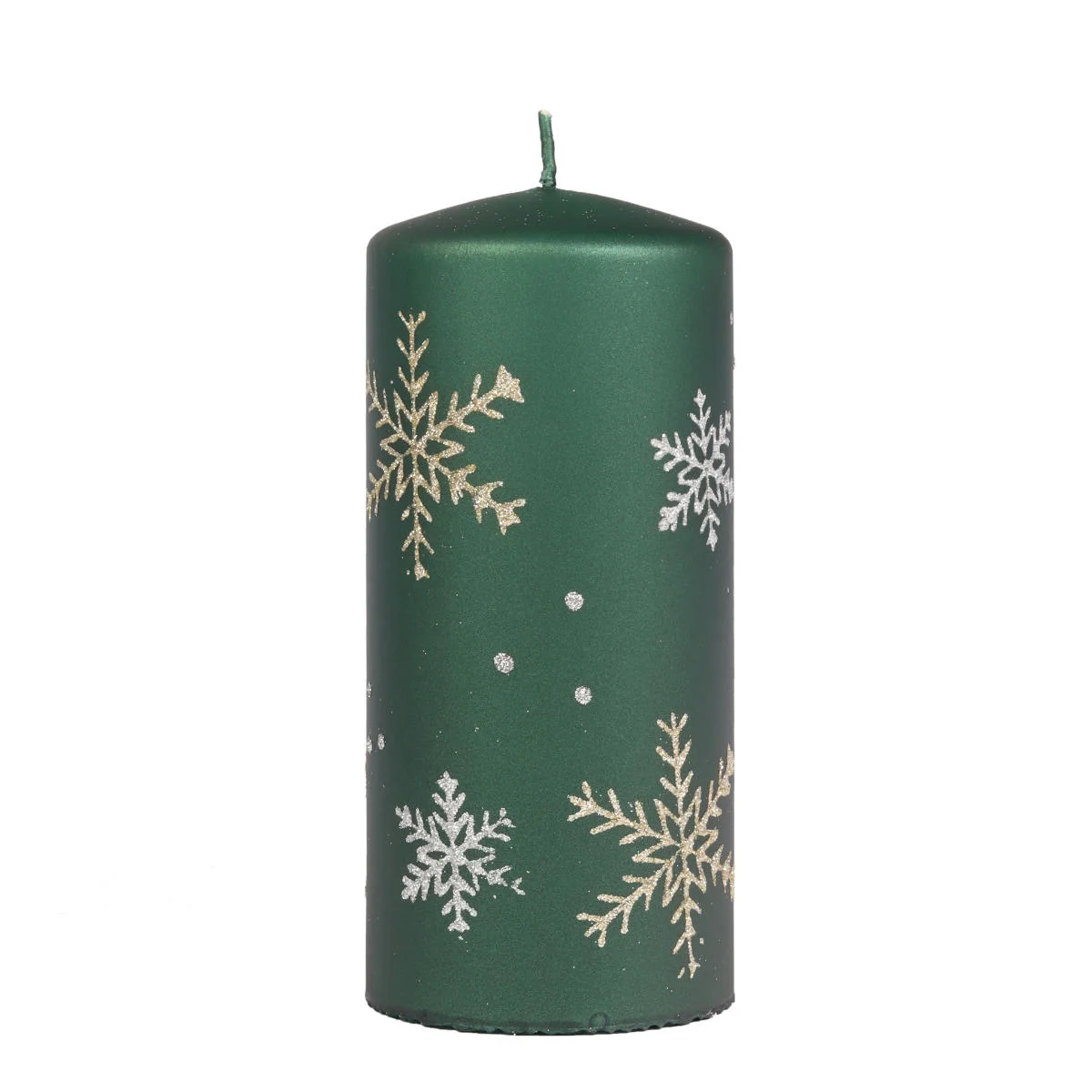 Zielona, duża świeca dekoracyjna z kolekcji Frost. Świeca walec o czasie palenia do ok. 112 godzin, wykonana z parafiny, ozdobiona białymi i złotymi śnieżynkami i delikatnie obsypana brokatem. Świeca jest bezwonna, idealnie sprawdzi się jako dekoracja do lampionu, świecznika, jako element stroika lub upominek czy dodatek do prezentu.