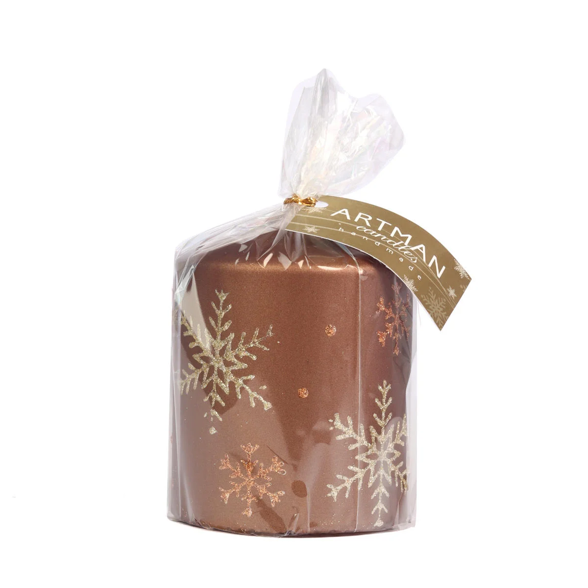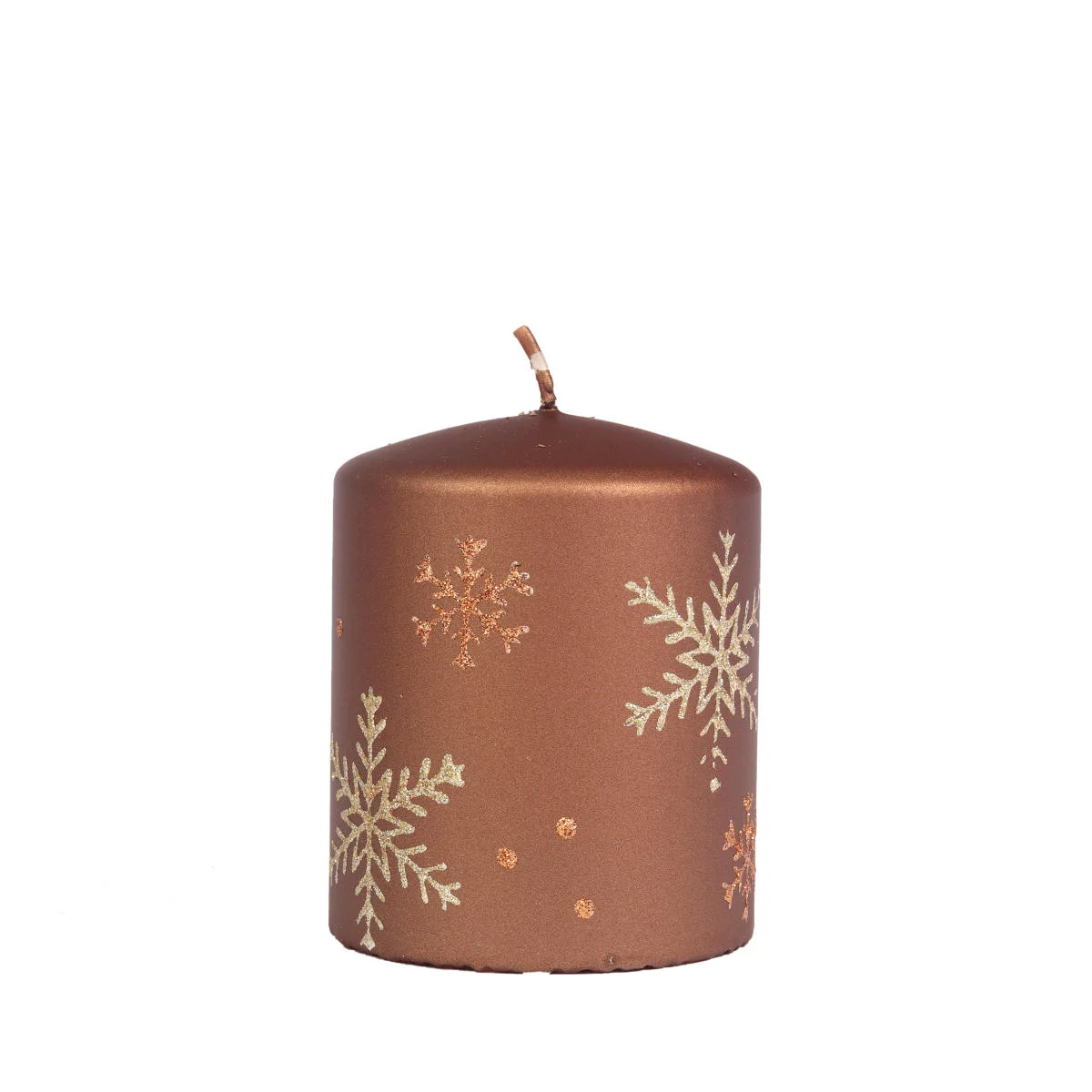 Brązowa, dekoracyjna świeczka o wysokości 9cm. Świeca walec o czasie palenia do 65 godzin, wykonana z parafiny, ozdobiona miedzianymi i złotymi śnieżynkami z brokatu. Świeca jest bezwonna, idealnie sprawdzi się jako dekoracja do świecznika, element stroika, jako upominek lub dodatek do prezentu.