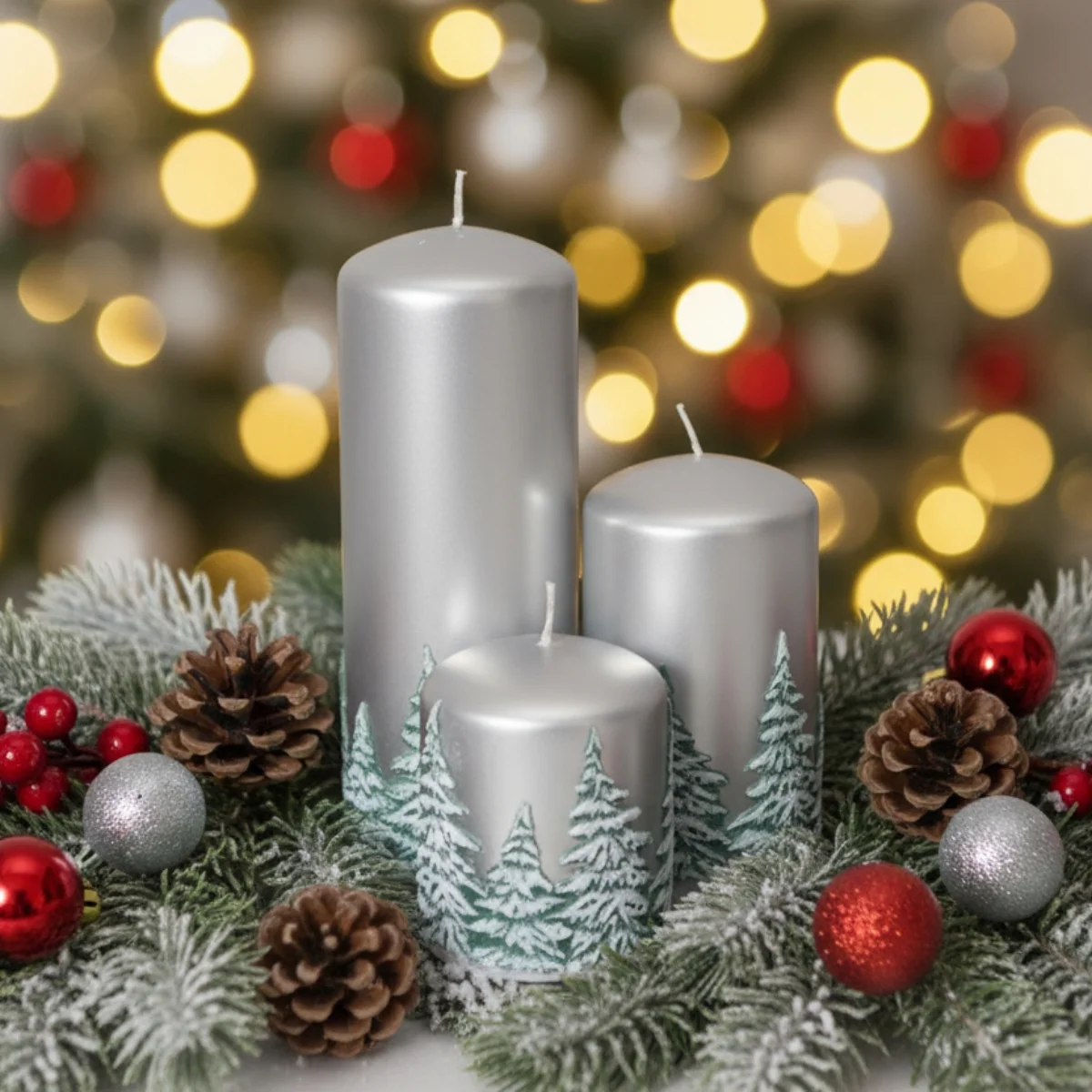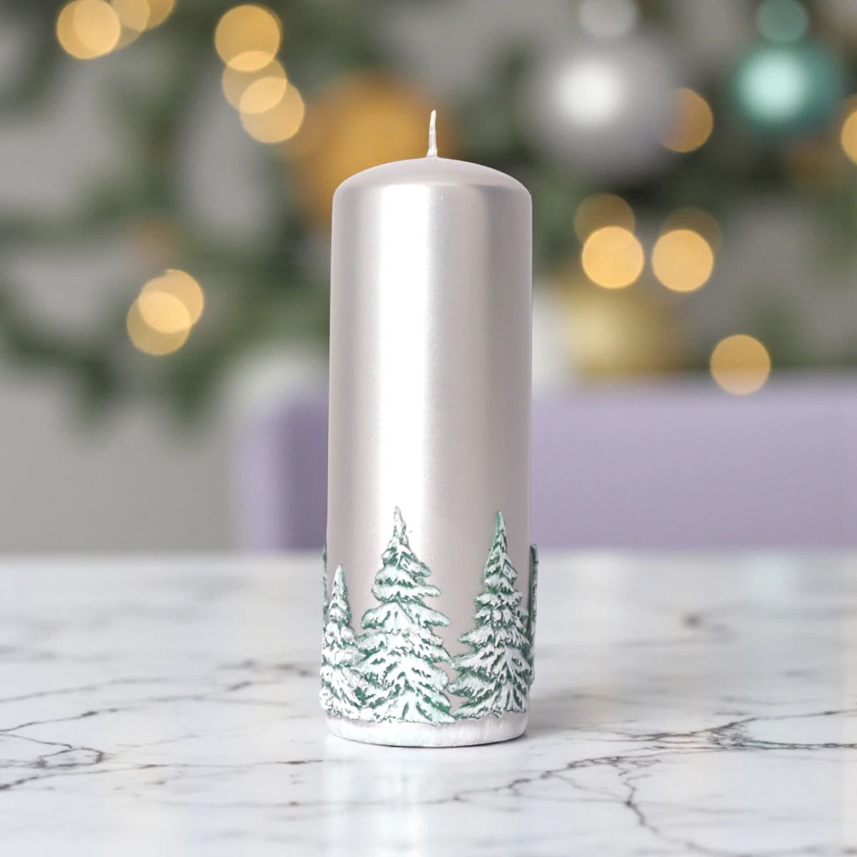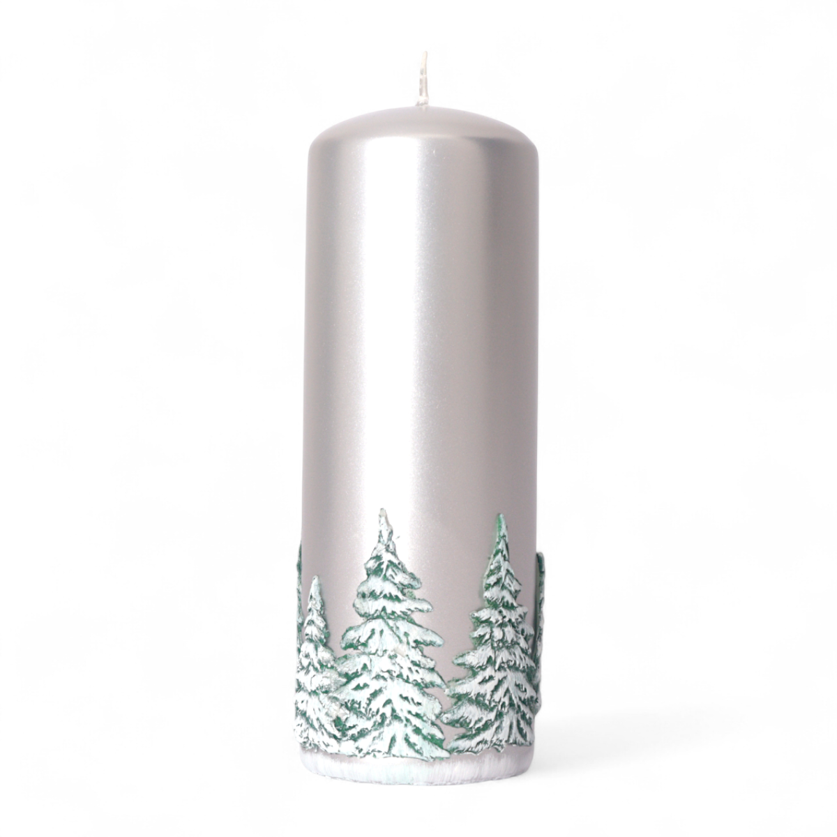 Wysoka, dekoracyjna świeca z kolekcji Frozen Dreams w srebrnym kolorze. Świeca o wysokości 20cm i czasie palenia do 72 godzin, wykonana z parafiny i ozdobiona tłoczonym wzorem przedstawiającym ośnieżone choinki. Świeca jest bezwonna, idealnie sprawdzi się jako dekoracja do świecznika, element stroika, jako upominek lub dodatek do prezentu.