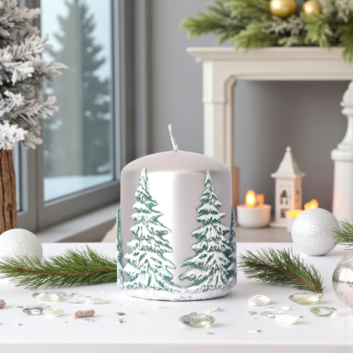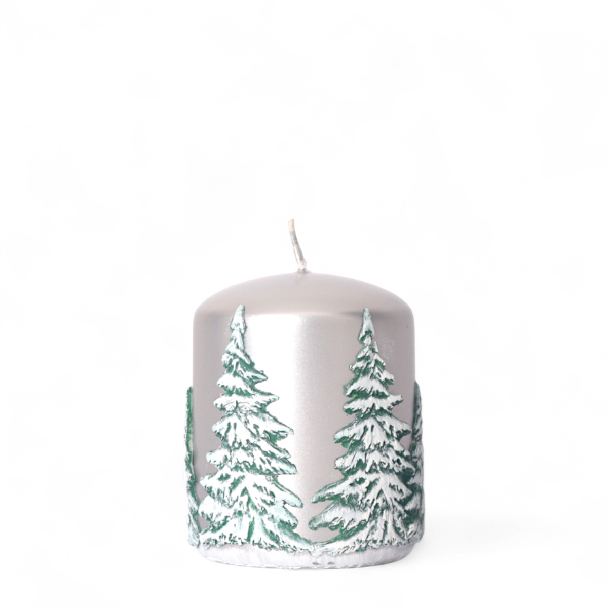 Dekoracyjna, mała świeczka ze świąteczną aplikacją z serii Frozen Dreams, srebrna z połyskiem. Świeca słupek o wysokości 9cm i czasie palenia do 40 godzin, wykonana z parafiny i ozdobiona przestrzennym wzorem przedstawiającym ośnieżone choinki. Świeca jest bezwonna, idealnie sprawdzi się jako dekoracja do świecznika, element stroika, jako upominek lub dodatek do prezentu.