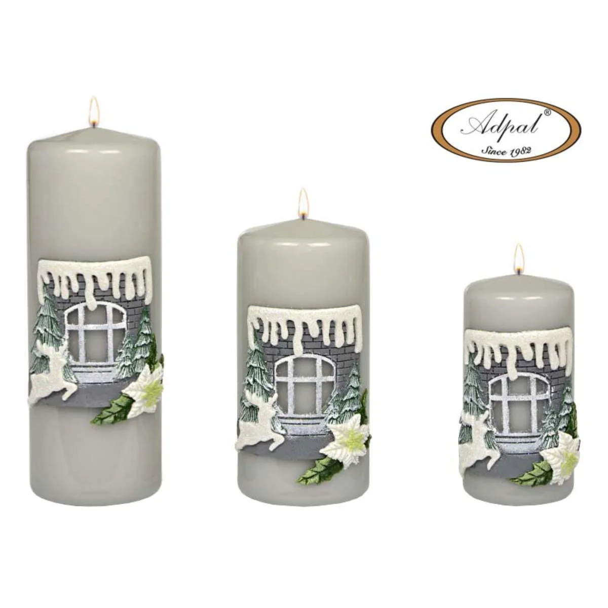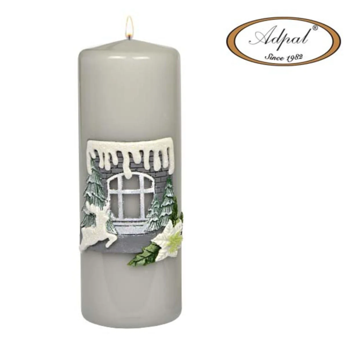 Świąteczna świeca dekoracyjna w kształcie słupka o wysokości 20cm i średnicy 7cm. Szara świeca wykonana z parafiny, ozdobiona przestrzennymi, biało-zielonymi motywami świątecznymi. Imitacja okna, renifer i elementy roślinne są wypukłe. Świeca jest bezwonna, idealnie sprawdzi się jako dekoracja lub jako upominek. Produkty marki Adpal posiadają atest PZH, wypalają się równomiernie, nie kapią i nie kopcą.