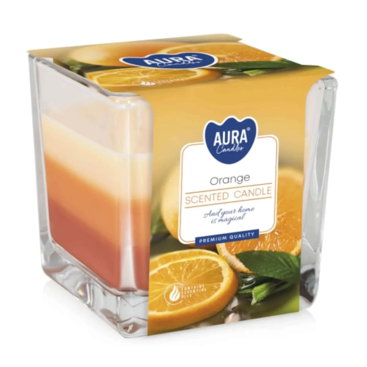 Trójkolorowa, pomarańczowa świeca zapachowa w kwadratowym szkle, z dwoma knotami. Wykonana z wysokiej jakości parafiny, o czasie spalania do 32h. Produkty marki Bispol posiadają atest PZH, wypalają się równomiernie, nie kapią i nie kopcą.