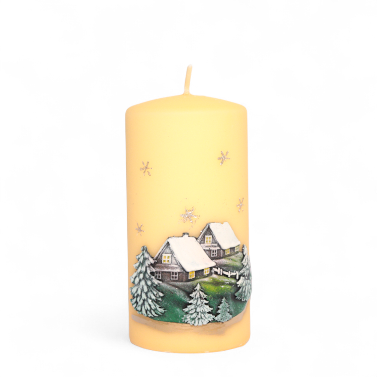 Dekoracyjna, świąteczna świeczka. Kremowy walec o wysokości 13cm. Świeca słupek o czasie palenia do ok. 83 godzin, wykonana z parafiny i ozdobiona wypukłą aplikacją przedstawiającą zimowy pejzaż z domkami w tle. Dodatkowo została bardzo delikatnie obsypana brokatem. Świeca jest bezwonna, idealnie sprawdzi się jako dekoracja do świecznika, element stroika, jako upominek lub dodatek do prezentu.