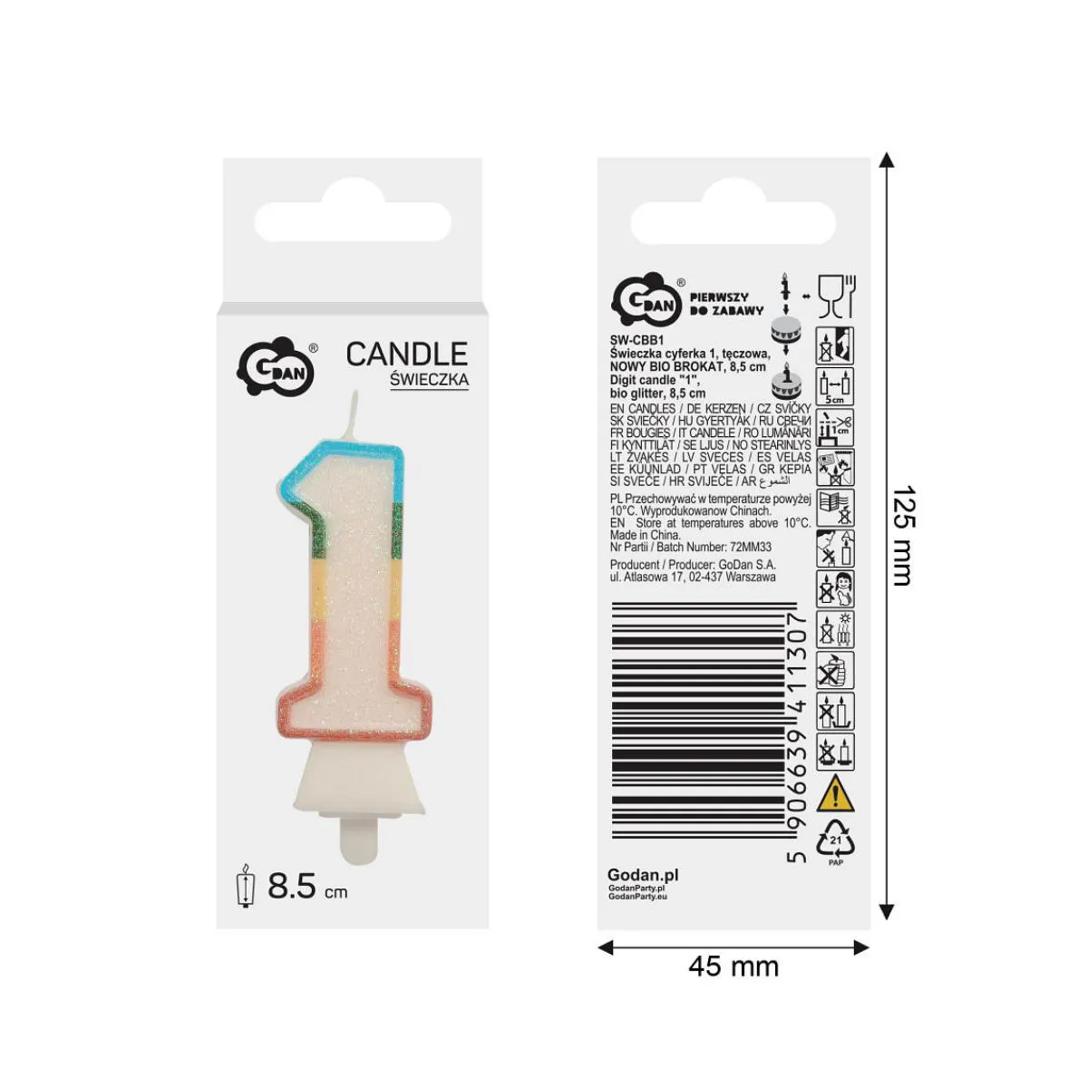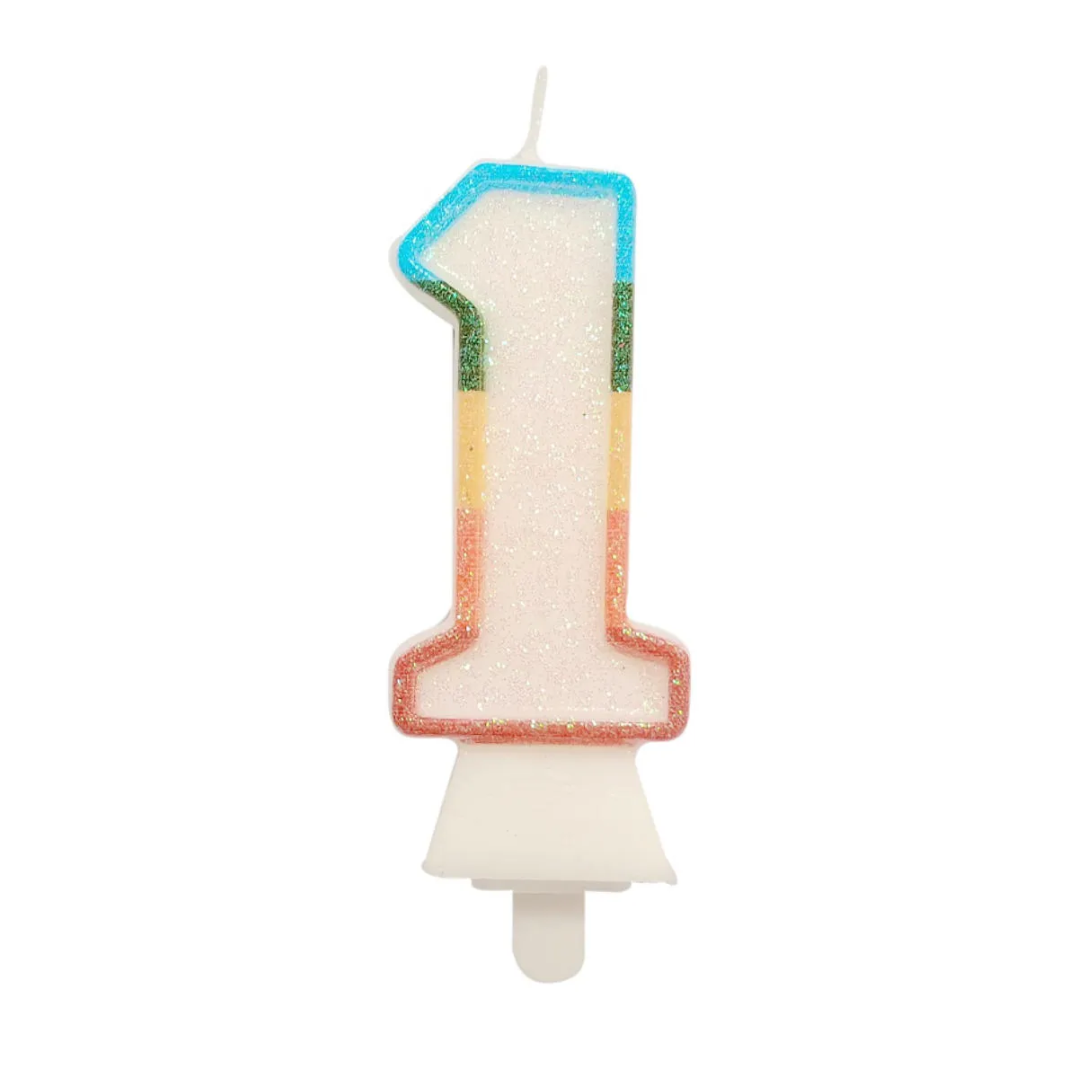 Świeczka urodzinowa cyfra jeden, biała z tęczowym konturem. Świeczka o wysokości 8,5cm, dodatkowo obsypana EKO brokatem. Ten rodzaj brokatu wykonany jest z celulozy roślinnej i jest w pełni biodegradowalny. Świeca wyposażona jest w podstawkę i będzie stabilnie utrzymywać się na torcie. Wysokość świeczki z podstawką to 10cm.