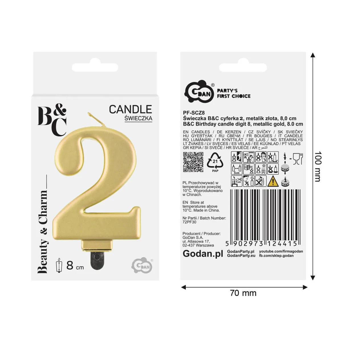 Świeczka Urodzinowa Cyfra 2 Metaliczna - Złoty