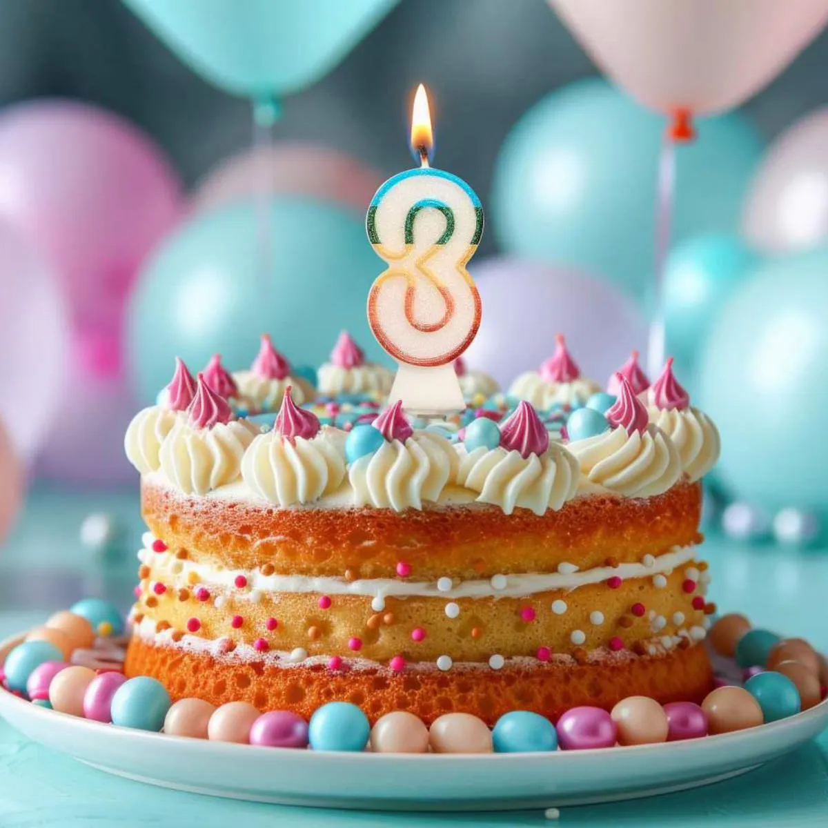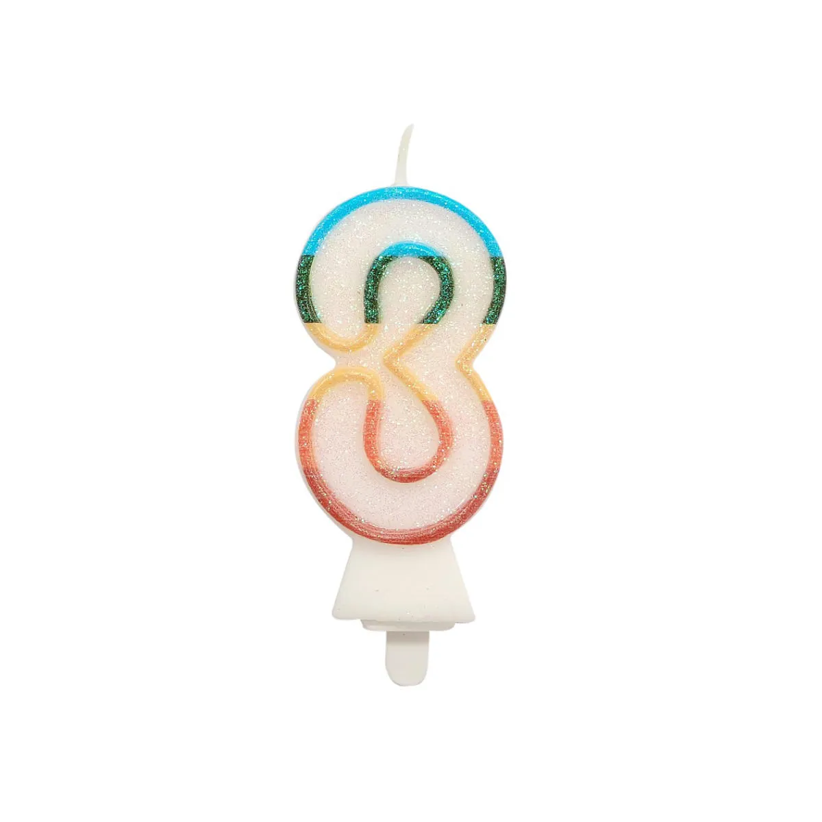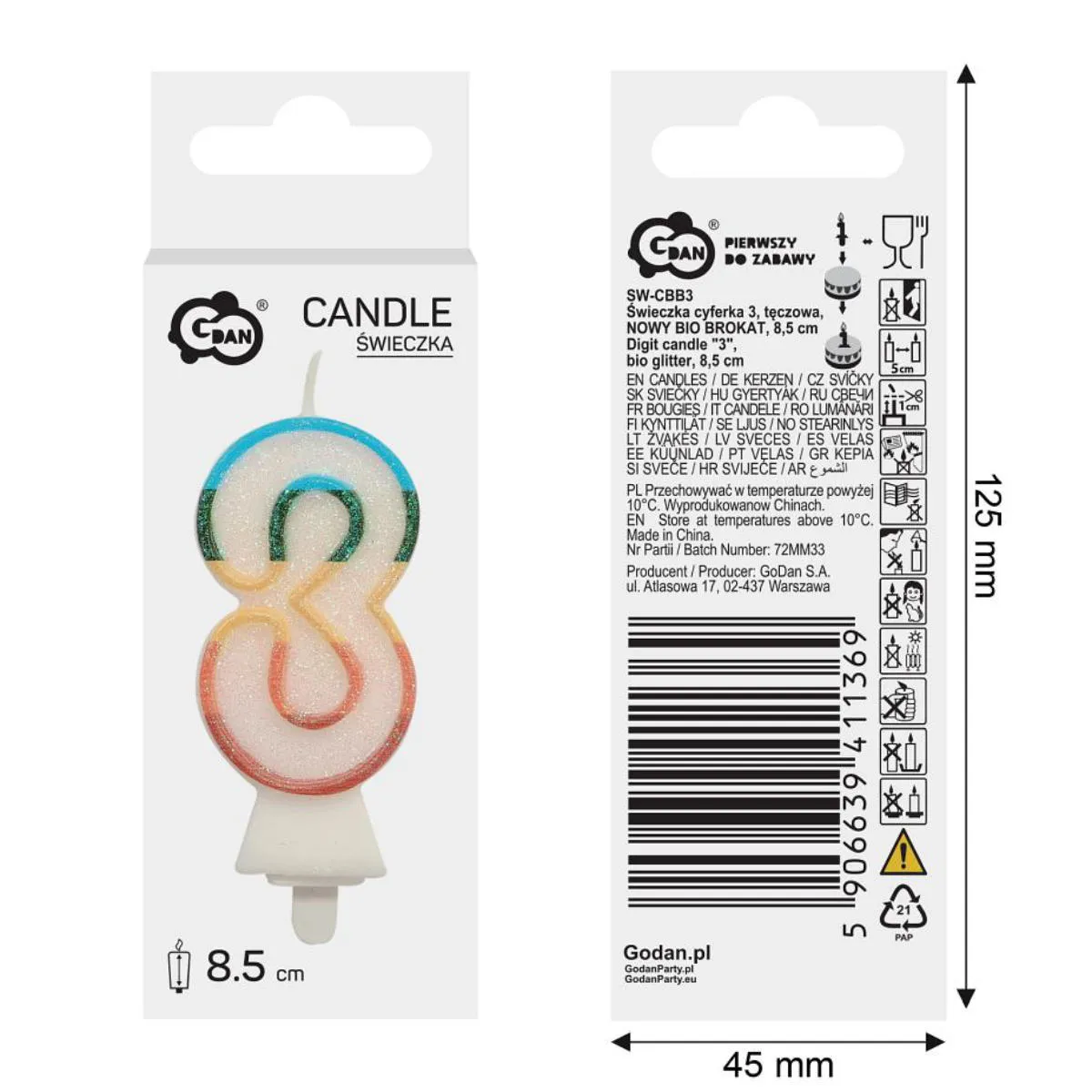 Świeczka urodzinowa w kształcie cyfry trzy, biała z tęczowym konturem. Świeczka o wysokości 8,5cm, dodatkowo obsypana EKO brokatem. Ten rodzaj brokatu wykonany jest z celulozy roślinnej i jest w pełni biodegradowalny. Świeca wyposażona jest w podstawkę i będzie stabilnie utrzymywać się na torcie. Wysokość świeczki z podstawką to 10cm.