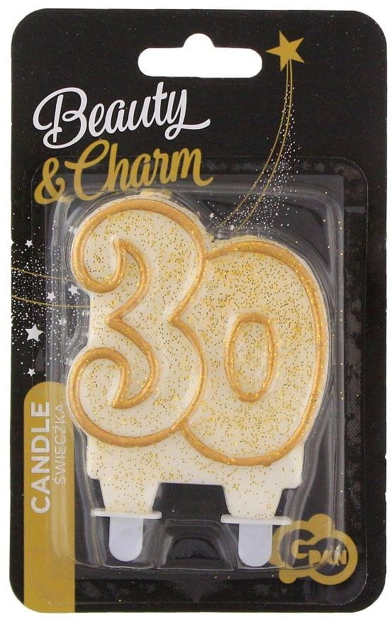 Urodzinowa świeczka cyfra 30 o wysokości 7cm. Ma biały kolor, posiada ozdobny złoty kontur a dodatkowo obsypana jest mieniącym się brokatem. Dwa piki stabilizujące gwarantują, że świeczka stabilnie utrzyma się w cieście. Świeca spala się równym płomieniem, nie kapie i nie wydziela żadnych zapachów.
