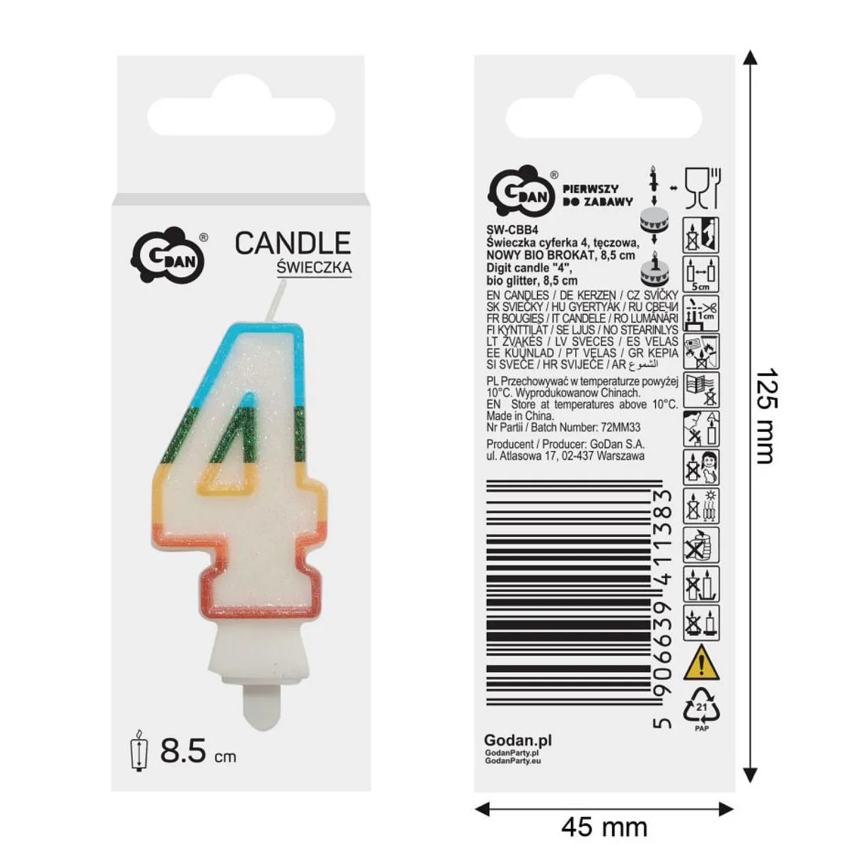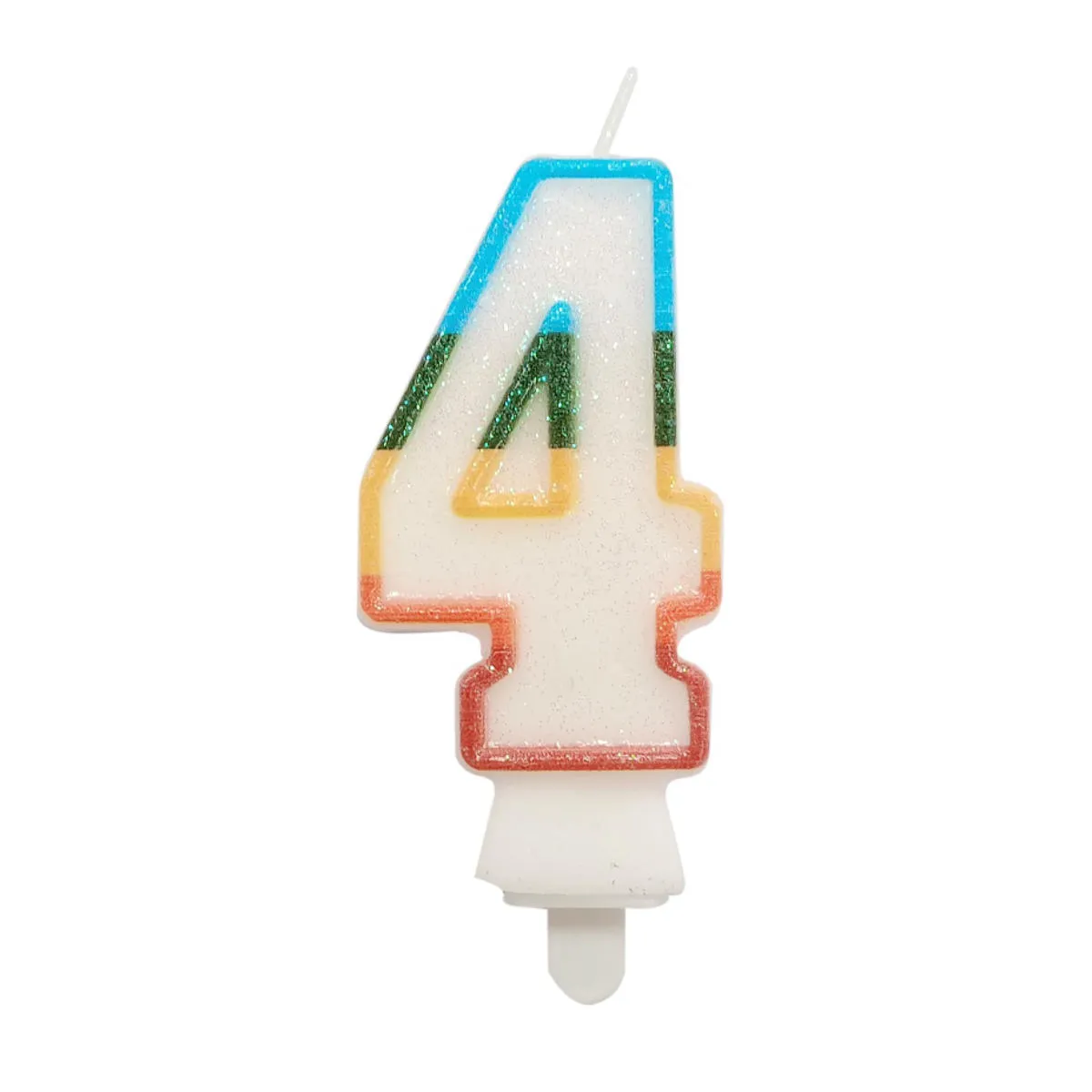 Świeczka urodzinowa w kształcie cyfry cztery, biała z tęczowym konturem. Świeczka o wysokości 8,5cm, dodatkowo obsypana EKO brokatem. Ten rodzaj brokatu wykonany jest z celulozy roślinnej i jest w pełni biodegradowalny. Świeca wyposażona jest w podstawkę i będzie stabilnie utrzymywać się na torcie. Wysokość świeczki z podstawką to 10cm.
