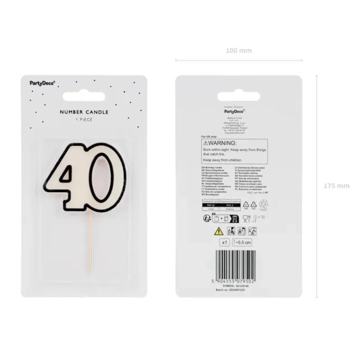 Świeczka urodzinowa o wysokości 5,5cm, w kształcie cyfry 40. Świeczka ma biały kolor i posiada ozdobny czarny kontur. Świeczka piker na drewnianym patyczku, służącym do wbicia w ciasto, tort lub babeczkę. Świeca spala się równym płomieniem, nie kapie i nie wydziela żadnych zapachów.