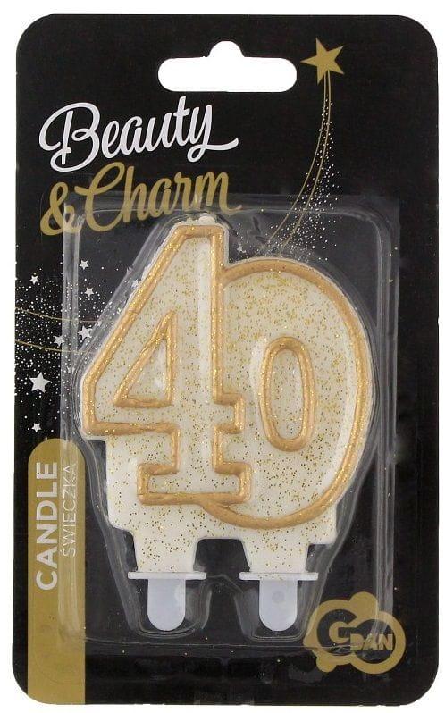 Świeczka na 40 urodziny, z kolekcji Beauty&Charm w białym kolorze. Świeczka obsypana jest brokatem i posiada złoty kontur, więc doskonale wkomponuje się w urodzinowe dekoracje. Wyposażona jest w dwa pozycjonery, dlatego będzie stabilnie utrzymywać się na torcie.