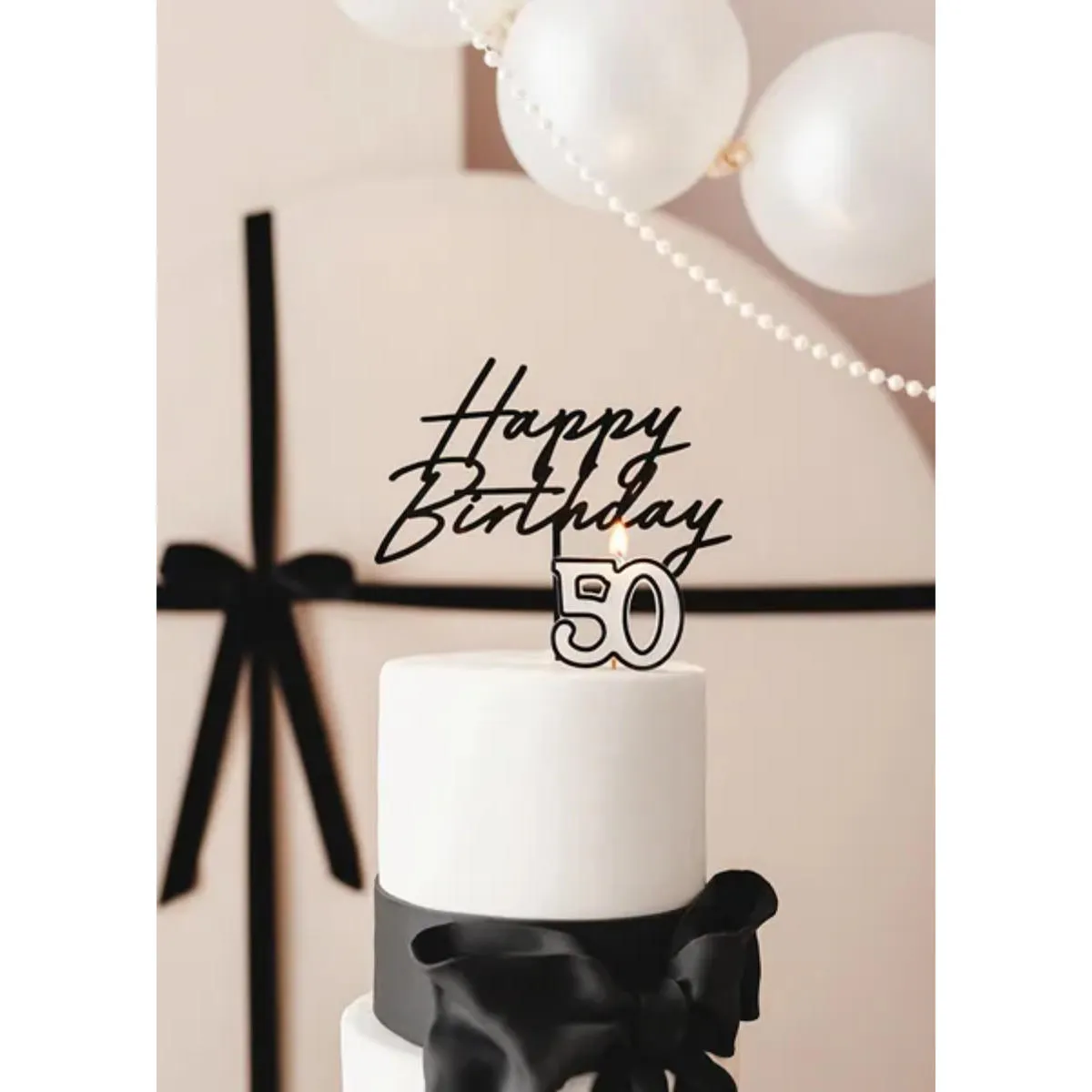 Cyfra 50, świeczka urodzinowa o wysokości 5,5cm. Świeczka ma biały kolor i posiada ozdobny czarny kontur. Świeczka piker na drewnianym patyczku, służącym do wbicia w ciasto, tort lub babeczkę. Świeca spala się równym płomieniem, nie kapie i nie wydziela żadnych zapachów.