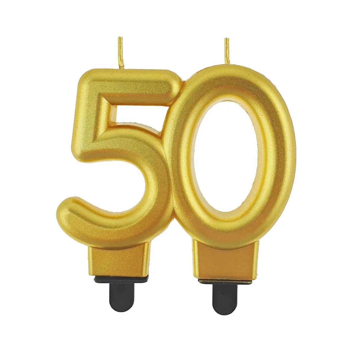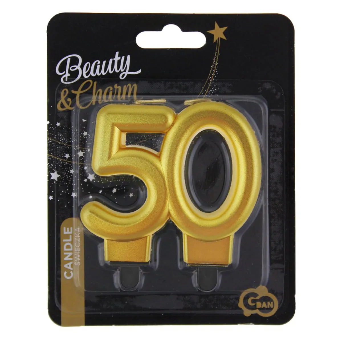 Złota świeczka tortowa, cyfra 50 z kolekcji Beauty&Charm. Świeczka o całkowitej wysokości 8cm, posiada dwie czarne podstawki, które umożliwiają umieszczenie świeczki w cieście oraz zapewniają jej stabilizację. Świeczka 50tka z metalicznym wykończeniem idealnie nadaje się również na jubileusz, rocznicę lub imprezę firmową.