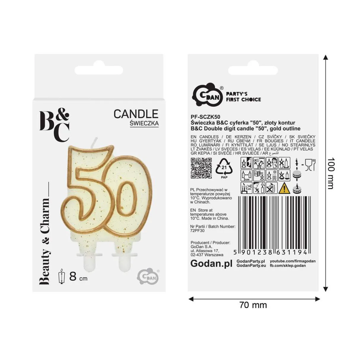 Świeczka na 50 urodziny, z kolekcji Beauty&Charm w białym kolorze. Świeczka obsypana jest brokatem i posiada złoty kontur, więc doskonale wkomponuje się w urodzinowe dekoracje. Wyposażona jest w dwa pozycjonery, dlatego będzie stabilnie utrzymywać się na torcie.