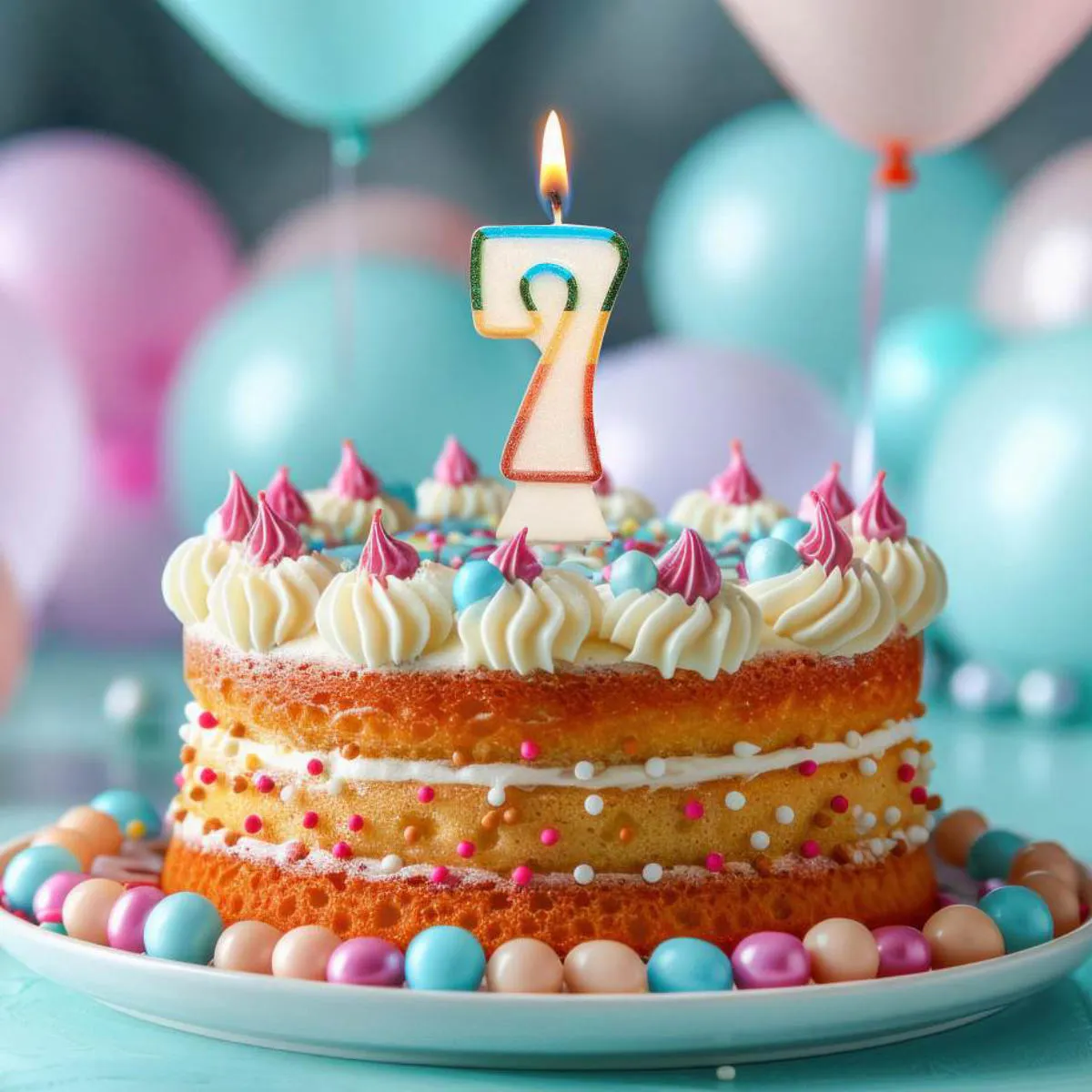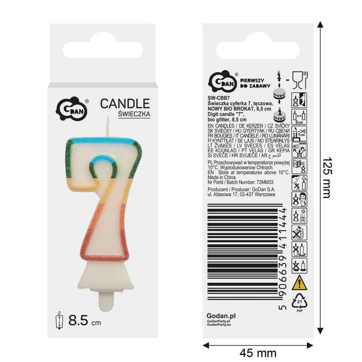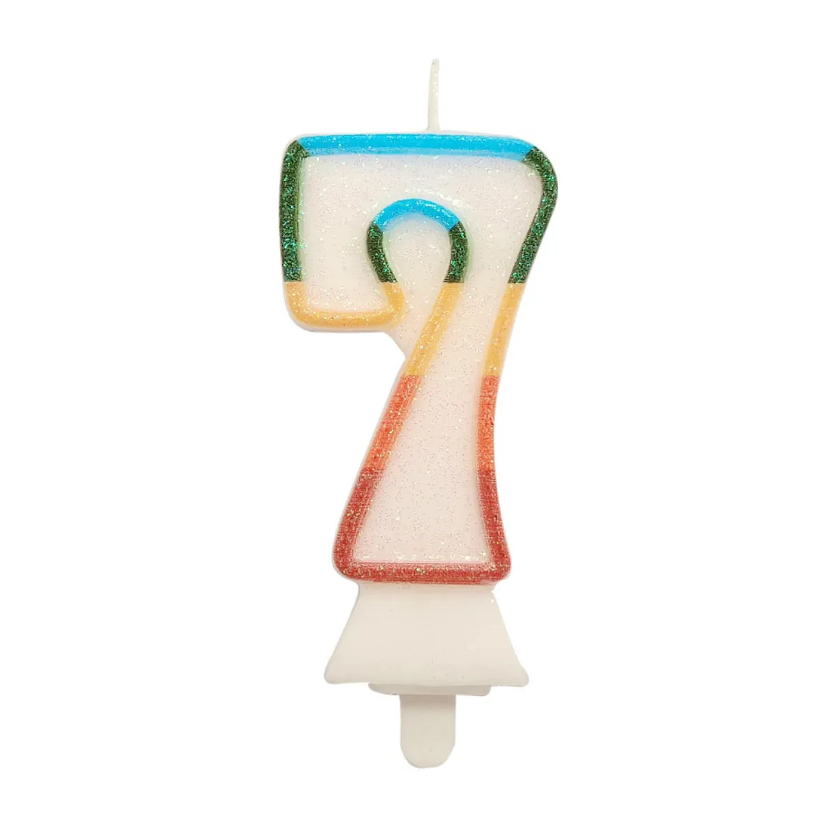 Świeczka urodzinowa w kształcie cyfry siedem, biała z tęczowym konturem. Świeczka o wysokości 8,5cm, dodatkowo obsypana EKO brokatem. Ten rodzaj brokatu wykonany jest z celulozy roślinnej i jest w pełni biodegradowalny. Świeca wyposażona jest w podstawkę i będzie stabilnie utrzymywać się na torcie. Wysokość świeczki z podstawką to 10cm.