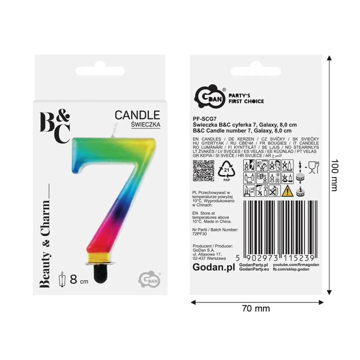 Świeczka multikolor cyfra 7. Świeczka charakteryzuje się wzorem - wielokolorowym gradientem wielu barw (złoty, zielony, niebieski, granatowy, fioletowy, różowy, czerwony). Dodatkowo jest także metalizowana. Bok oraz pozycjoner świecy jest w kolorze srebrnym. Produkt jest skierowany do jubilatów w każdym wieku.