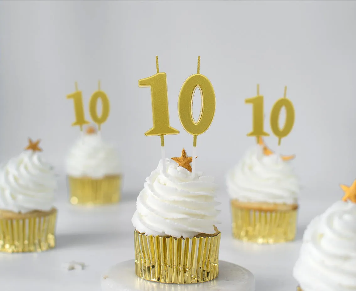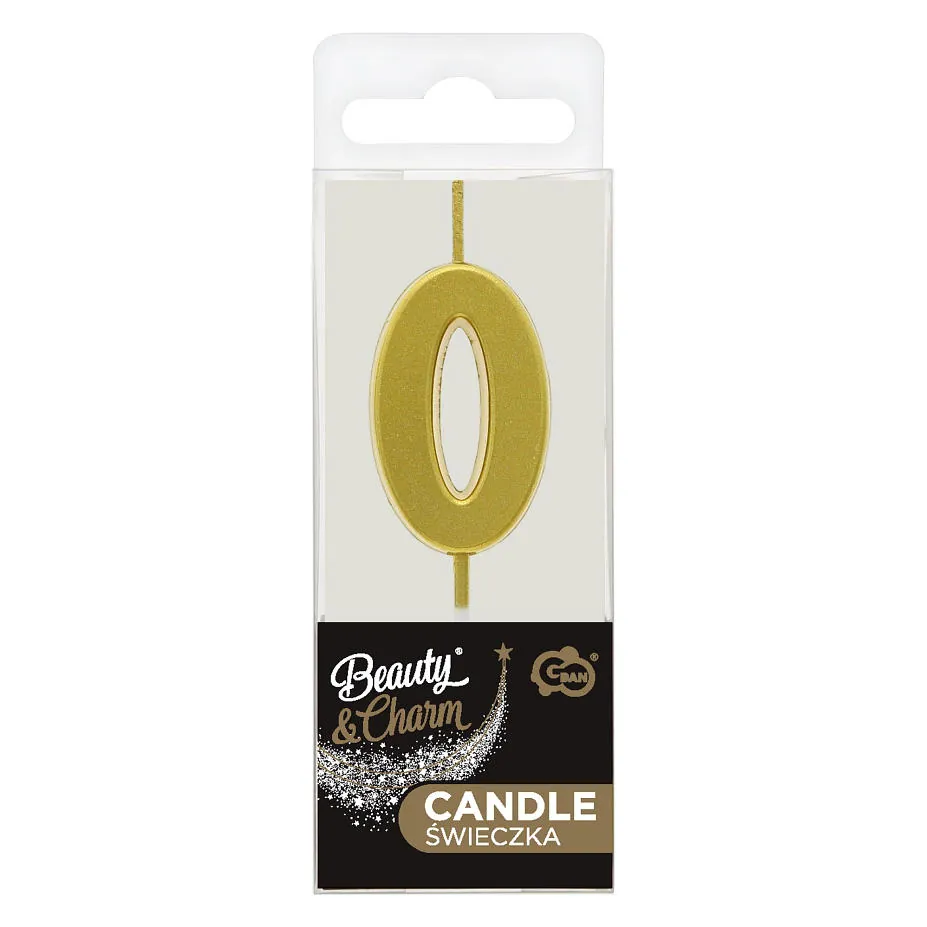 Świeczka urodzinowa cyfra 0, piker do babeczek lub tortów. Metalicznie złota świeczka z kolekcji Beauty&Charm, ozdobi każde ciasto, deser lub owoce. Znajduje się na patyczku z tworzywa sztucznego i stabilnie utrzymuje się w cieście lub gęstym kremie. Atutem jest obszerność kolekcji która zawiera także girlandy urodzinowe, balony, dekoracje wiszące, słomki i ozdoby na tort.
