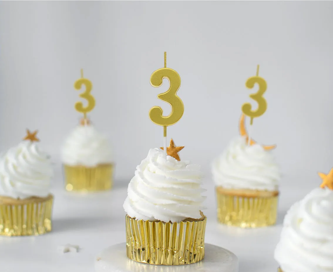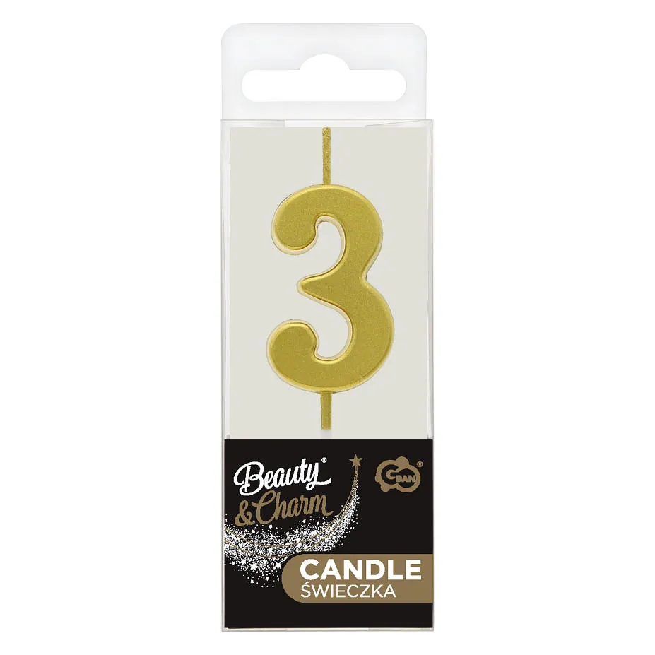 Świeczka urodzinowa cyfra 3, piker do babeczek lub tortów, o wysokości 9,5cm. Złota, błyszcząca świeczka z kolekcji Beauty&Charm, ozdobi każde ciasto, deser lub owoce. Znajduje się na patyczku z tworzywa sztucznego i stabilnie utrzymuje się w cieście lub gęstym kremie. Świeczka cechuje się wysoką jakością wykonania i nie kopci przy spalaniu. Jest w złotym kolorze z pięknym, metalicznym połyskiem. Doskonale zaprezentuje się na cieście i nada mu elegancki charakter.