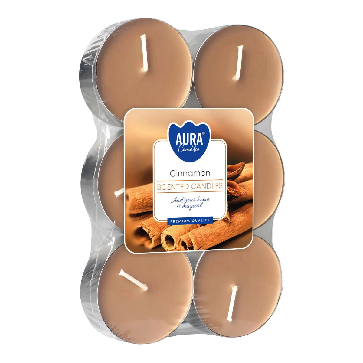 Zapachowe świeczki typu tealight. W opakowaniu znajduje się 6 świeczek o zapachu cynamonu. Świeczki w kolorze brązowym, o średnicy 57mm i wysokości 24mm. Posiadają metalowe osłonki, które chronią przed rozlewaniem roztopionego wosku. Idealnie nadają się do wszelkiego rodzaju dekoracyjnych lampionów, świeczników, latarenek oraz figurek z miejscem na świeczkę.