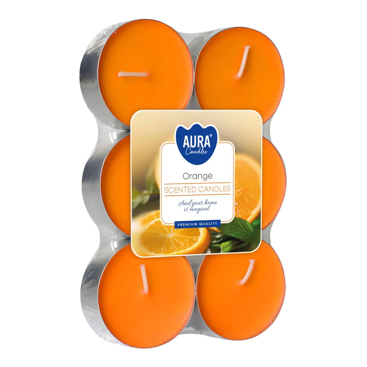 Zapachowe świeczki typu tealight. W opakowaniu znajduje się 6 świeczek o zapachu pomarańczy. Świeczki w kolorze pomarańczowym, o średnicy 57mm i wysokości 24mm. Posiadają metalowe osłonki, które chronią przed rozlewaniem roztopionego wosku. Idealnie nadają się do wszelkiego rodzaju dekoracyjnych lampionów, świeczników, latarenek oraz figurek z miejscem na świeczkę.