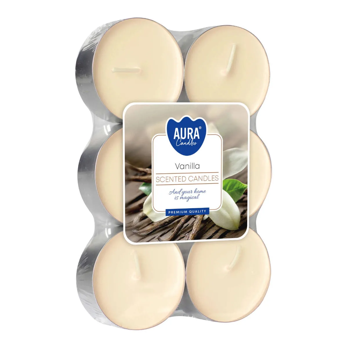 Zapachowe świeczki typu tealight. W opakowaniu znajduje się 6 świeczek o zapachu wanilii. Świeczki w kremowym kolorze, o średnicy 57mm i wysokości 24mm. Posiadają metalowe osłonki, które chronią przed rozlewaniem roztopionego wosku. Idealnie nadają się do wszelkiego rodzaju dekoracyjnych lampionów, świeczników, latarenek oraz figurek z miejscem na świeczkę.