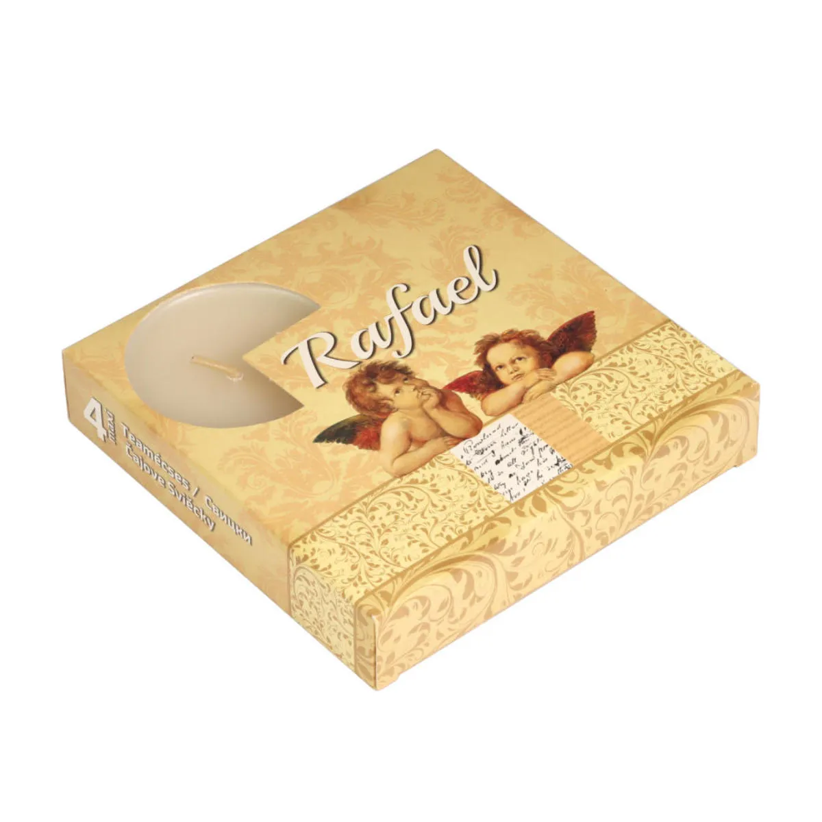 Zapachowe świeczki typu tealight, Rafael. W opakowaniu znajdują się 4 świeczki o zapachu waniliowym. Świeczki w kolorze kremowym, o średnicy 57mm i wysokości 20mm. Podgrzewacze o czasie palenia do 6 godzin, posiadają metalowe osłonki, które chronią przed rozlewaniem roztopionego wosku. Idealnie nadają się do wszelkiego rodzaju dekoracyjnych lampionów, świeczników, latarenek oraz figurek z miejscem na świeczkę.