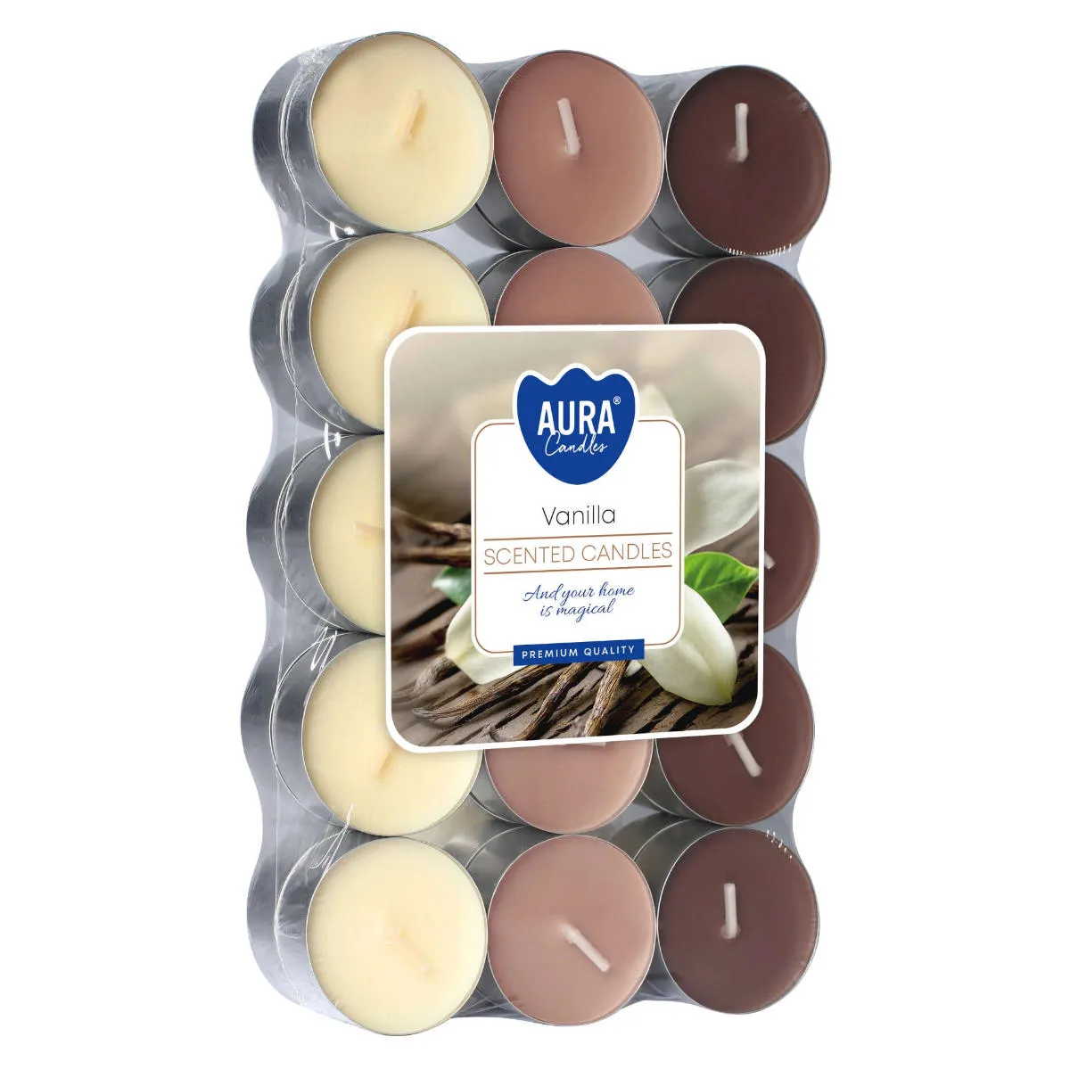 Świeca typu tealight o zapachu wanilii. W opakowaniu znajduje się 30 świeczek podgrzewaczy. Wykonane z wysokiej jakości parafiny, o czasie spalania do 4h. Produkty marki Bispol posiadają atest PZH, wypalają się równomiernie, nie kapią i nie kopcą.
