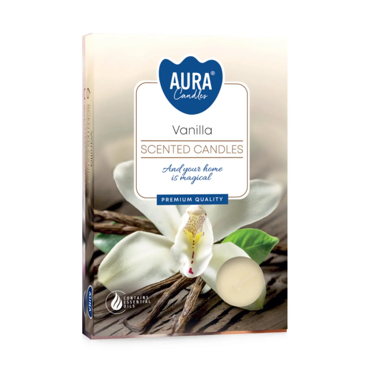 Świeczki typu tealight, zapachowe o aromacie wanilii. Idealnie nadają się do świeczników lub kominków zapachowych. W opakowaniu znajduje się 6 świeczek podgrzewaczy. Wykonane z wysokiej jakości parafiny, o czasie spalania do 4h. Produkty marki Bispol posiadają atest PZH, wypalają się równomiernie, nie kapią i nie kopcą.