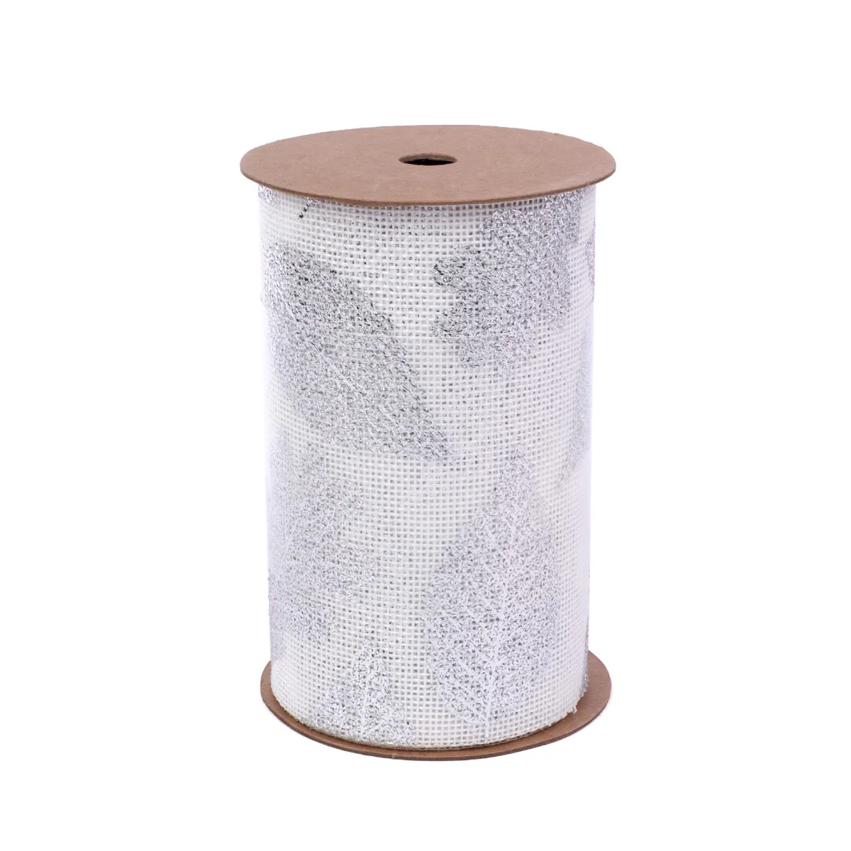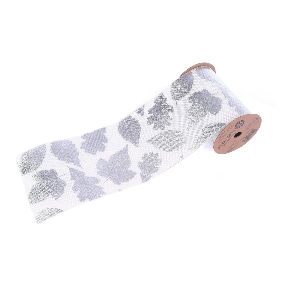 Jutowa taśma dekoracyjna o szerokości 12cm z drobnym splotem. Biała wstążka z nadrukiem w postaci srebrnych, metalicznych liści. Idealnie nadaje się do tworzenia kokard, dekoracji na różne okazje oraz do pakowania prezentów. Jest też polecana do ozdabiania doniczek, wazonów, stroików i kompozycji florystycznych.