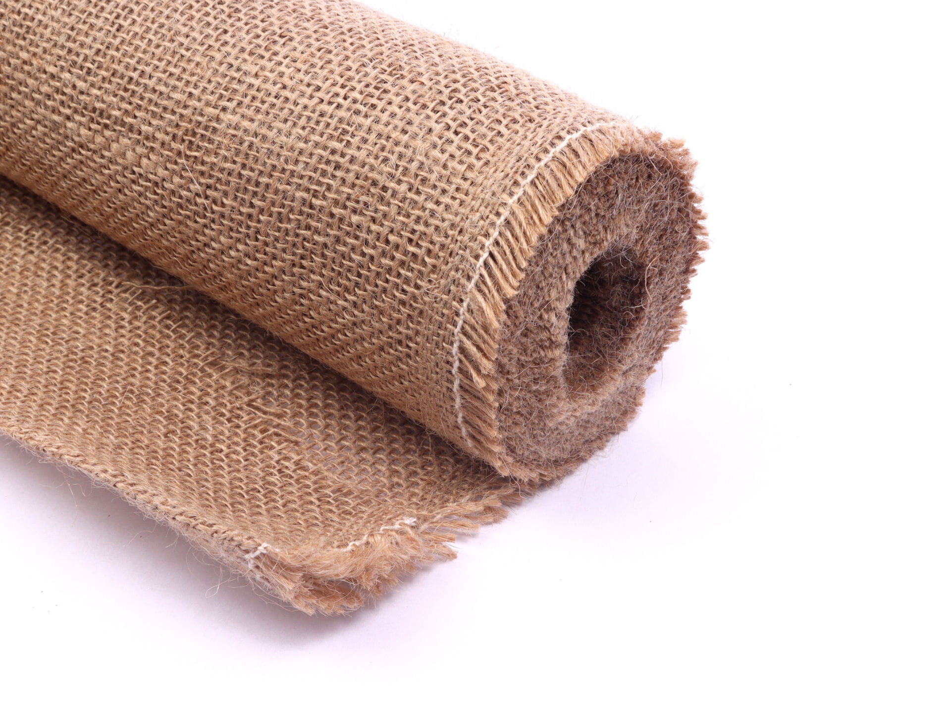 Dekoracyjna tkanina jutowa na rolce, w naturalnym kolorze.