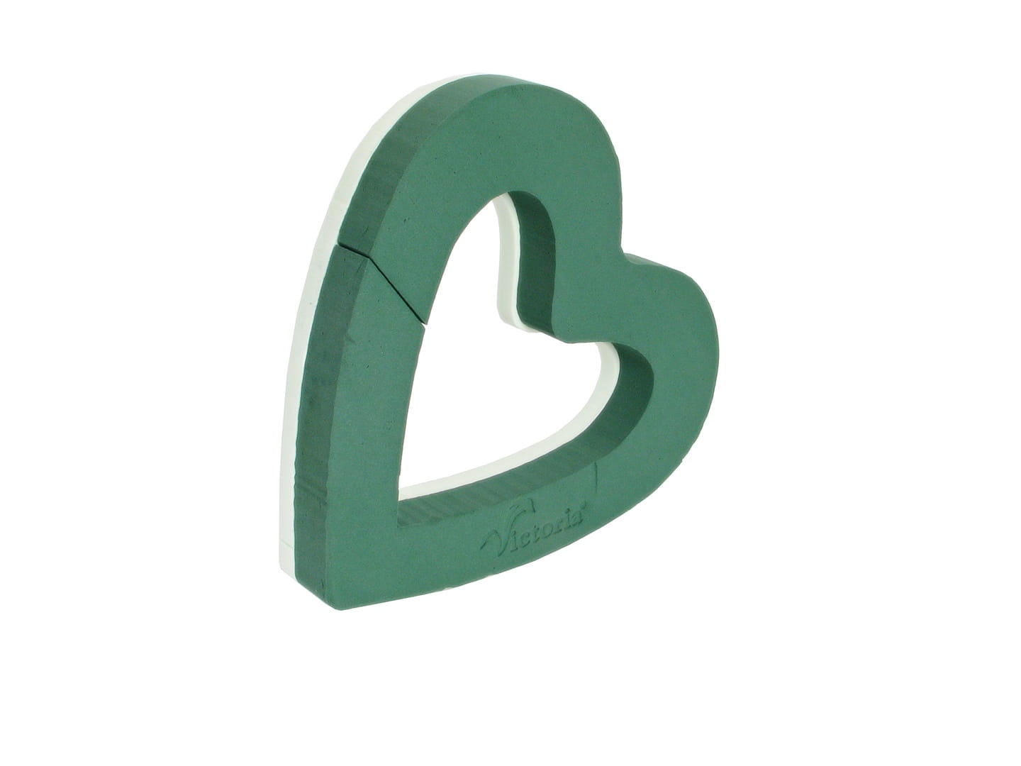 Pianka florystyczna firmy Victoria w kształcie otwartego serca. Gąbka umieszczona jest na 2cm podstawie ze styroduru, co zabezpiecza ja przed wgnieceniami. Kształt pozwala niemalże bezproblemowo wykonać kompozycje kwiatową serce idealnie na ślub, wesele bądź zaręczyny. Skład chemiczny gąbki uniemożliwia rozwój bakterii w środowisku mokrym, co wydłuża okres świeżości roślin.