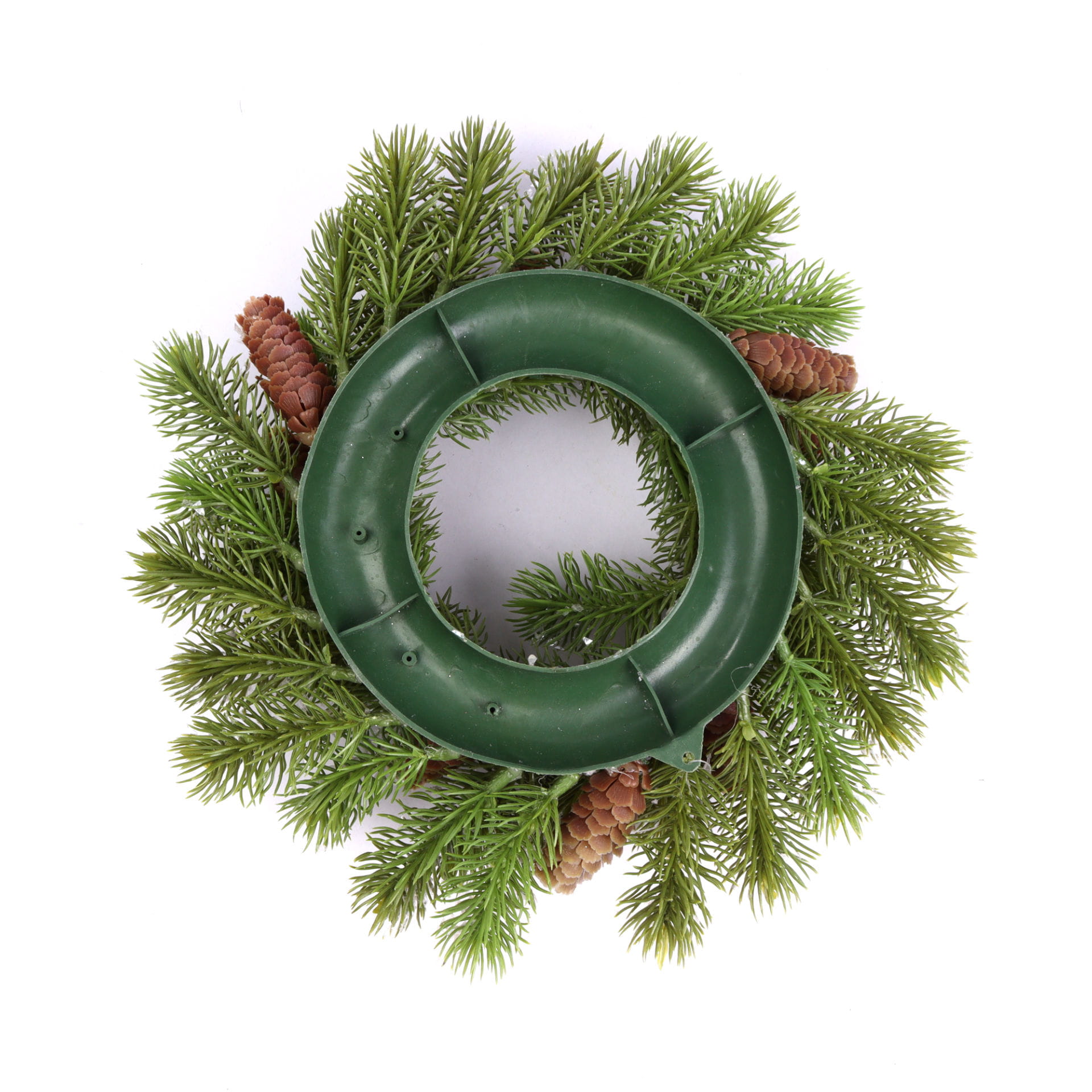 Wianek świąteczny, świerkowy z szyszkami, o średnicy zewnętrznej 32cm. Wykonany jest z folii PE i wygląda bardzo naturalnie. Wianek jest gęsty a igły są odpowiednio długie w stosunku do wielkości. Gałązki można formować według potrzeby. Całość jest delikatnie obsypana sztucznym śniegiem co daje bardzo zimowy efekt. To idealna baza do tworzenia świątecznych dekoracji florystycznych. Wianek idealny jest na świecę o średnicy do 10cm.
