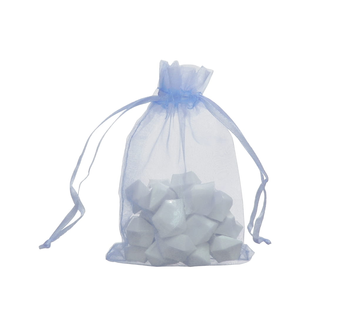 Komplet dekoracyjnych, błękitnych woreczków, wykonanych w całości z organzy. Torebki idealnie sprawdzą się do pakowania słodyczy, biżuterii, kosmetyków i innych drobnych upominków. Każdy woreczek wyposażony jest w sznurek służący do ściągania, zamykania. W opakowaniu znajduje się 12 tiulowych woreczków o wymiarach 9x13cm.