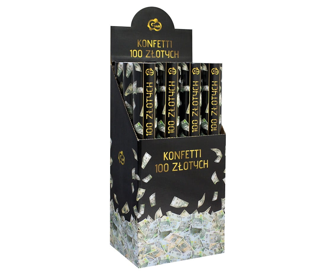 Konfetti banknoty 100zł zamknięte w tubie o długości 40cm. Wyrzut na wysokość 7-8 metrów następuje za pomocą sprężonego powietrza. Efekt jest naprawdę spektakularny, nie mówiąc o zabawie przy zbieraniu „pieniędzy”.