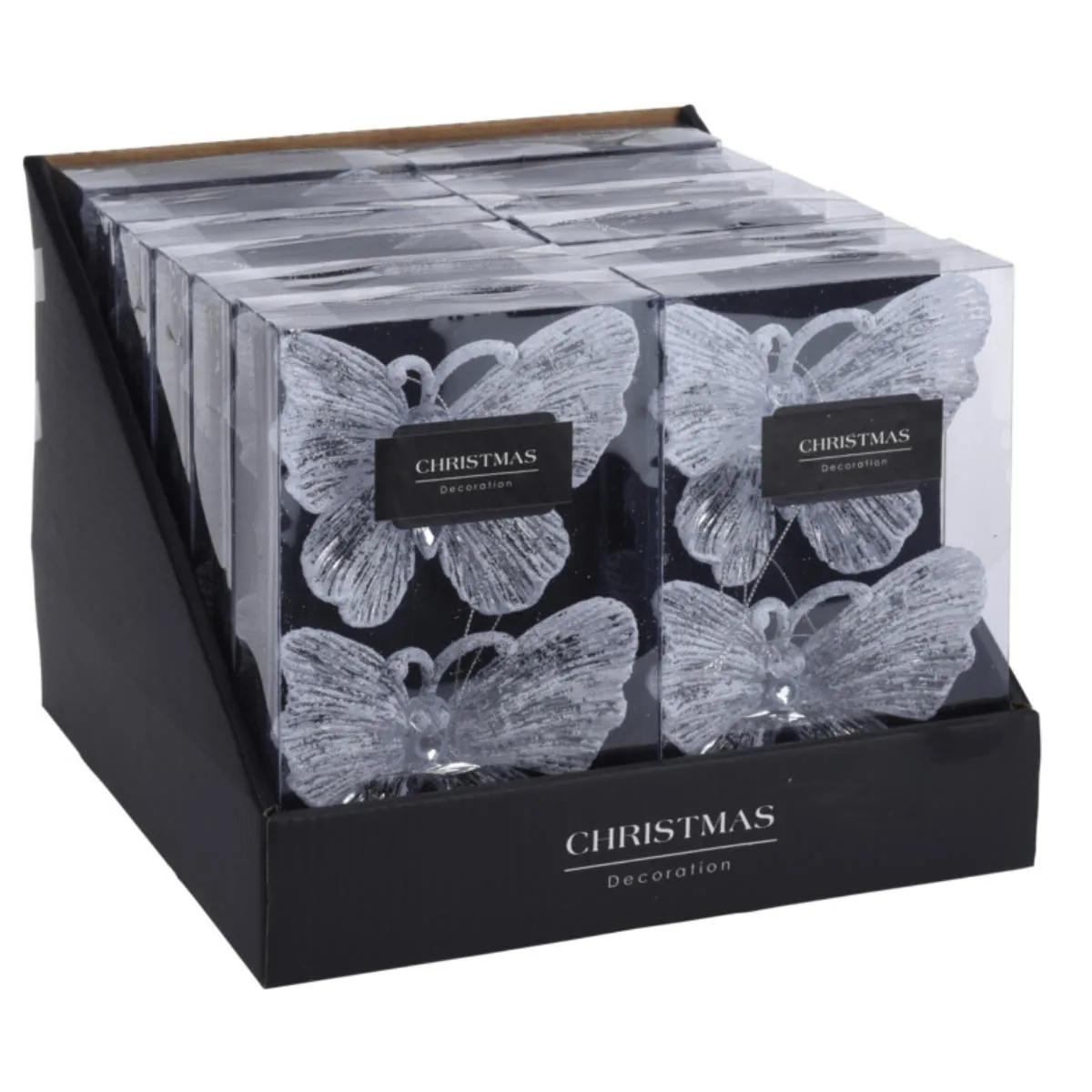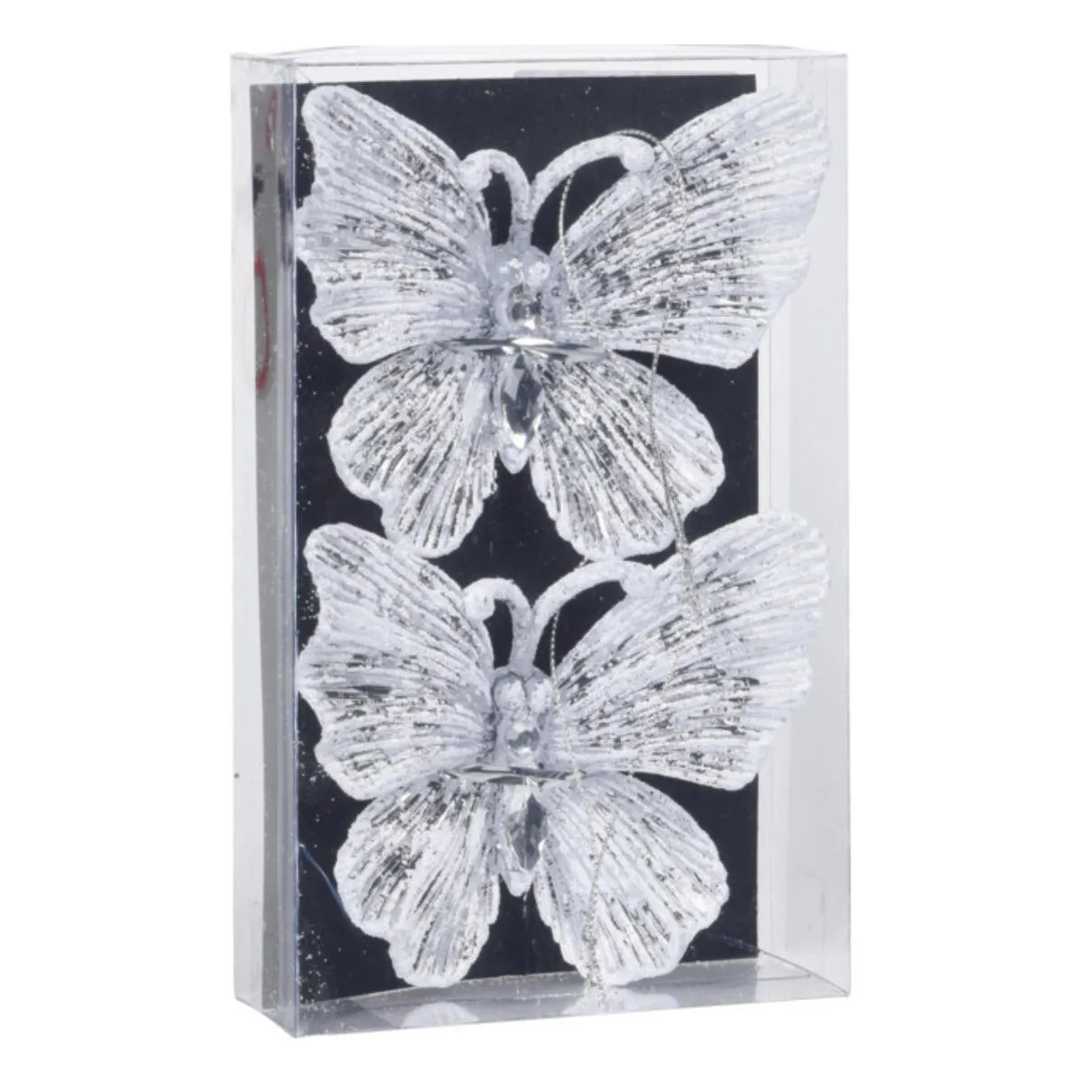 Świąteczna ozdoba choinkowa, motyle do zawieszenia. Wykonane w całości z akrylu, nietłukące motylki obficie obsypane sztucznym śniegiem, co daje efekt delikatnego szronu. Idealnie nadają się na samodzielną dekorację lub dodatek przy pakowaniu prezentów czy tworzeniu stroików, wianków i innych kompozycji świątecznych. Każdy motyl posiada srebrny sznureczek umożliwiający zawieszanie. Podana cena dotyczy kompletu 2 zawieszek.