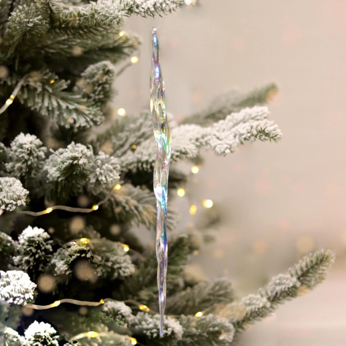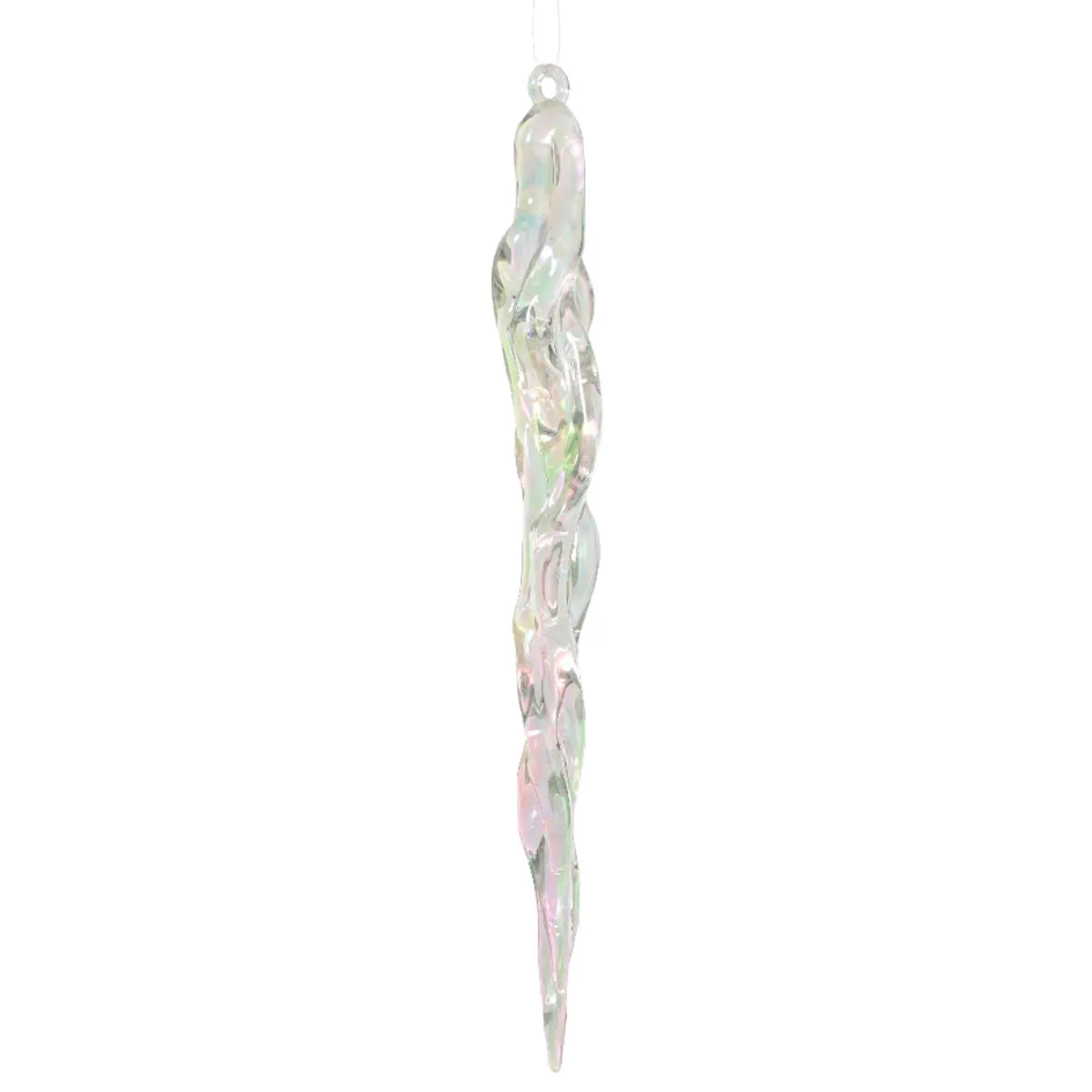 Świąteczna zawieszka, sopel wykonany z przeźroczystego akrylu z opalizującym wykończeniem. Sopel o długości 28,5cm, posiada otwór na sznureczek lub drucik. Idealnie nadaje się do przystrojenia wianka, drzewka lub okna. Sprawdzi się również jako wykończenie girlandy, dekoracja stołu oraz element każdej kompozycji.