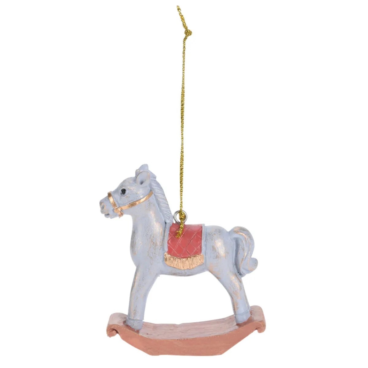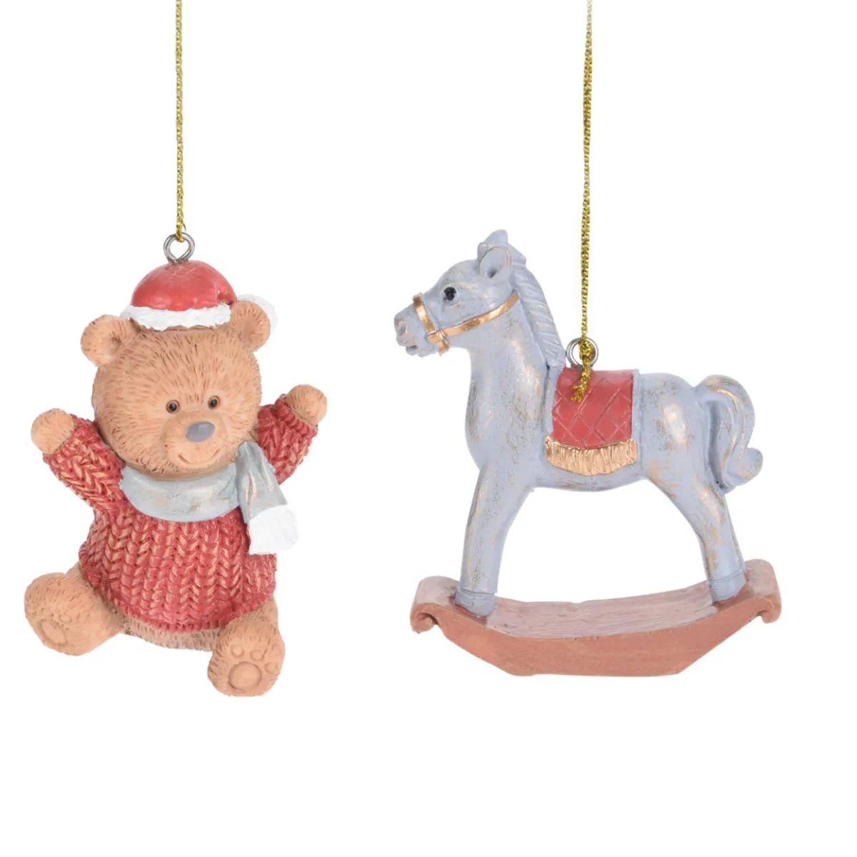 Dekoracyjna ozdoba w formie zawieszki. Wykonana z wysokiej jakości tworzywa sztucznego, kolorowa zawieszka z matowym wykończeniem. Dostępna w dwóch wariantach do wyboru : w kształcie misia i w kształcie konika na biegunach. Każda figurka posiada złoty sznureczek umożliwiający zawieszanie. Sprawdzi się jako dekoracja bożonarodzeniowego stołu oraz jako całoroczna ozdoba pokoju dziecięcego. Idealnie nadaje się również na upominek lub dodatek do prezentu. Podana cena dotyczy 1 sztuki z wybranego wzoru.