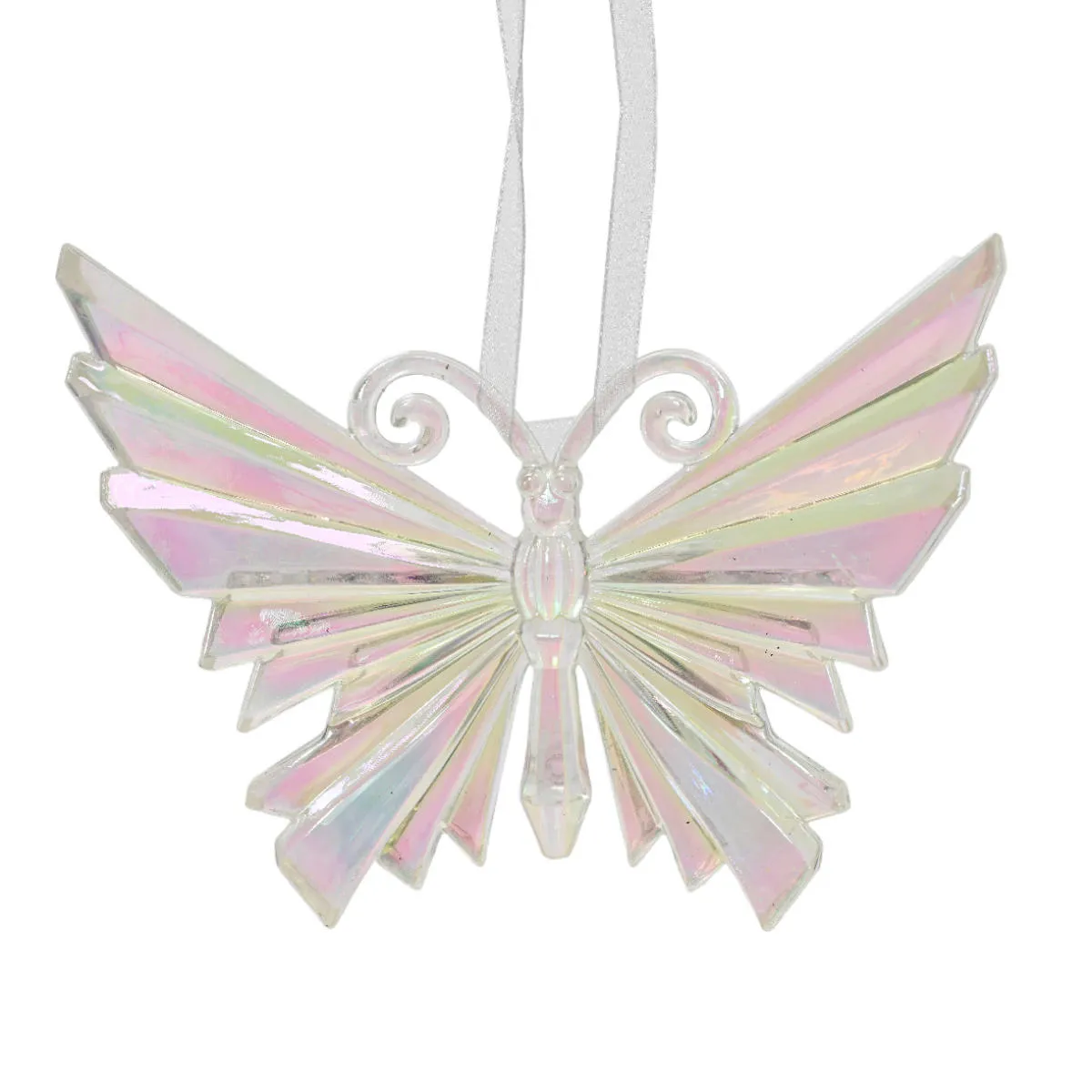 Dekoracja do zawieszenia. Przeźroczysty, nietłukący motyl z opalizującym wykończeniem. Wykonana w całości z akrylu ozdoba do zawieszania, pięknie odbija światło. Idealnie nadaje się na samodzielną dekorację lub dodatek przy pakowaniu prezentów czy tworzeniu stroików i wianków. Dekoracja posiada białą tasiemkę umożliwiającą zawieszanie.