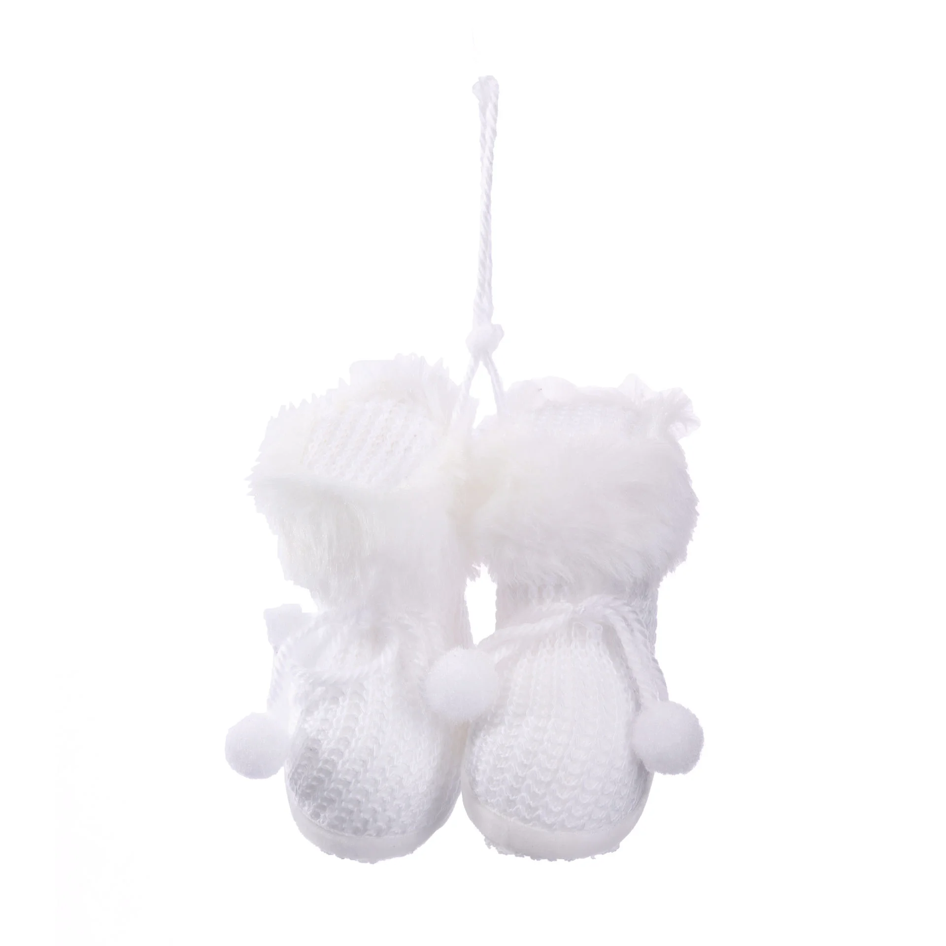 Świąteczna zawieszka w postaci białych bucików. Wykonana ze styropianu i pokryta materiałem o nieregularnej fakturze. Dodatkowo górna część bucików ozdobiona została syntetycznym futerkiem i delikatną kokardką ze sznurka zakończonego pomponami. Buciki idealnie nadają się na samodzielną dekorację lub dodatek przy pakowaniu prezentów, przy tworzeniu stroików, wianków i innych kompozycji świątecznych. Dekoracja posiada sznureczek w kolorze bucików, służący do zawieszania.