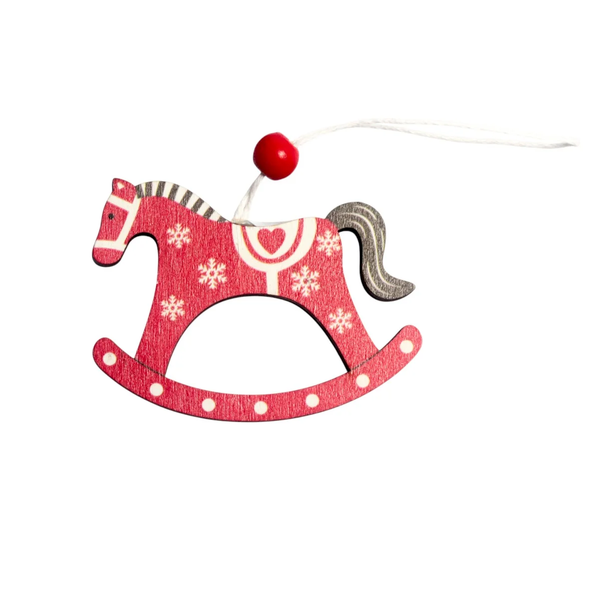 Mały, drewniany konik na biegunach. Jednostronna zawieszka z naturalnym sznureczkiem. Czerwony konik na płozach, o wymiarach 5,5x7cm, ozdobiony kilkoma białymi śnieżynkami. Sprawdzi się jako element stroika, idealnie nadaje się również na upominek lub dodatek do prezentu.