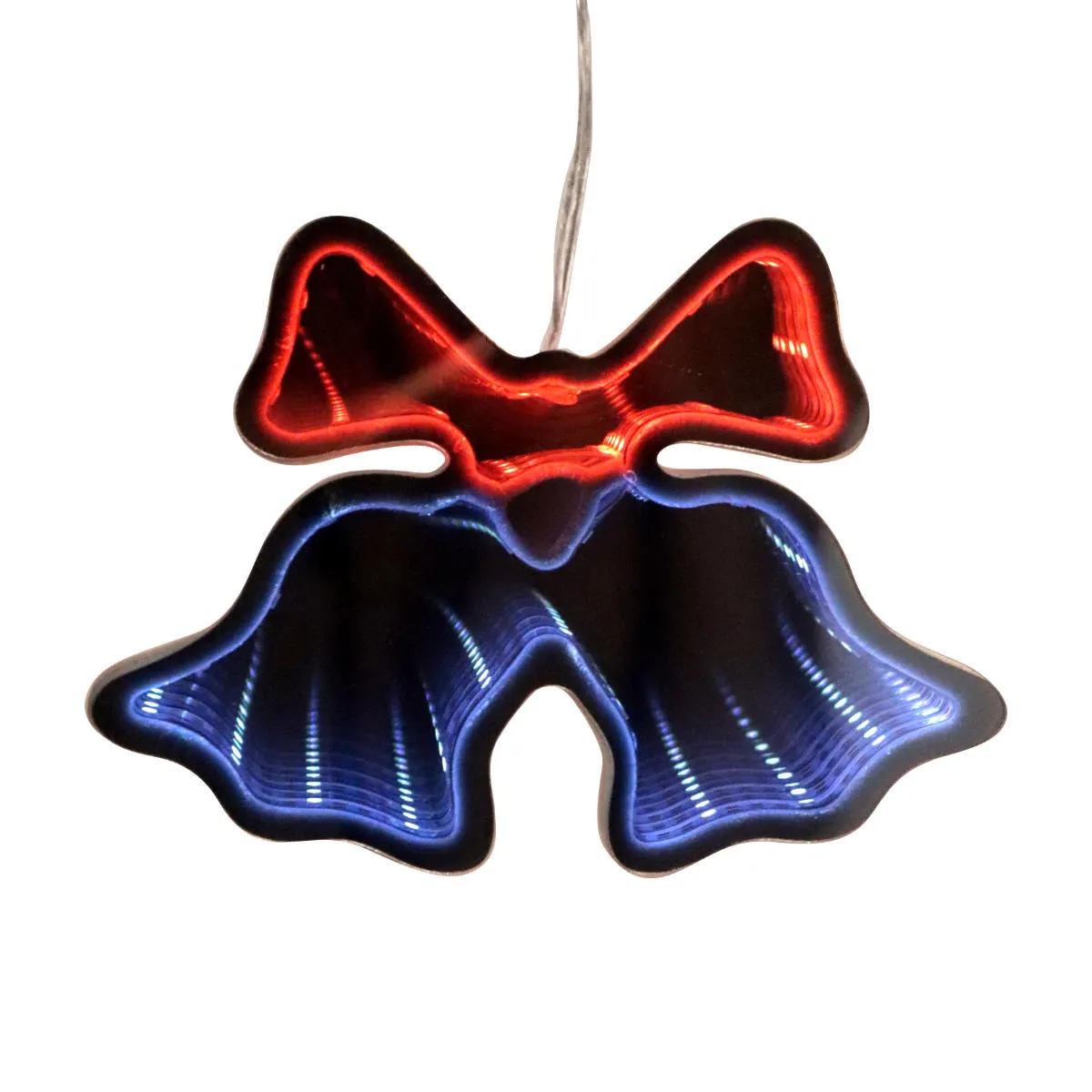 Świąteczna dekoracja, zawieszka LED 3D z imitacją lustra. Dekoracja w trzech wariantach do wyboru : w kształcie skrzata, bałwanka i dzwonków. Każda posiada dwa rodzaje światła : światło o zimnej barwie oraz światło czerwone. Ozdoba wykonana z tworzywa sztucznego. Po włączeniu otrzymujemy efekt niekończącego się tunelu światła. Diody w zawieszce zasilane są trzema bateriami typu AA 1,5V (brak w zestawie). Idealnie nadaje się jako samodzielna dekoracja lub element kompozycji. Świetnie sprawdzi się także jako upominek lub dodatek do prezentu. Dekoracja posiada funkcję Timer 6h/18h, która pozwala na ustawienie czasu pracy. Po włączeniu tej funkcji dioda świeci przez 6 godzin, a przez następne 18 godzin pozostaje wyłączona. Oświetlenie przeznaczone do użytku wewnątrz pomieszczeń.