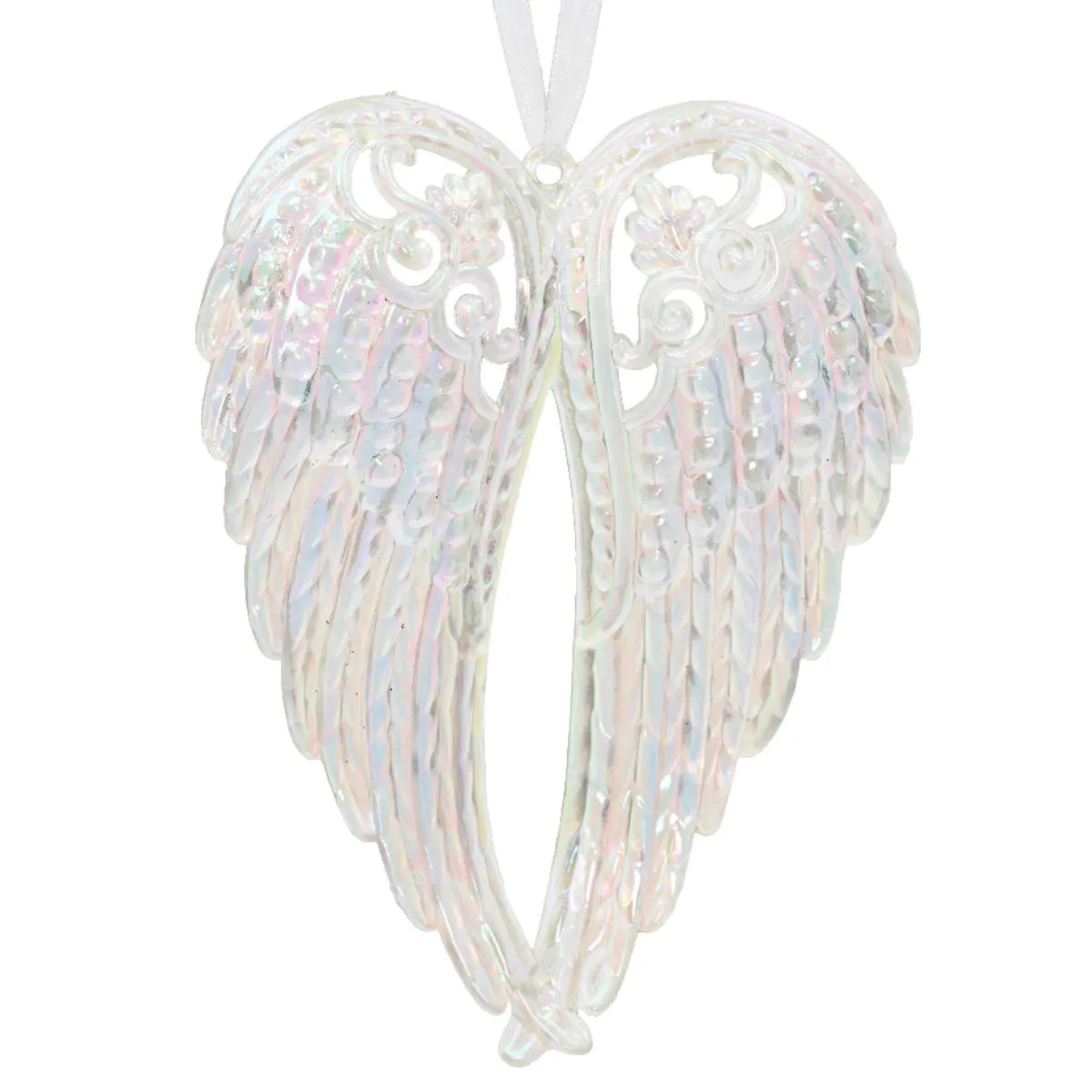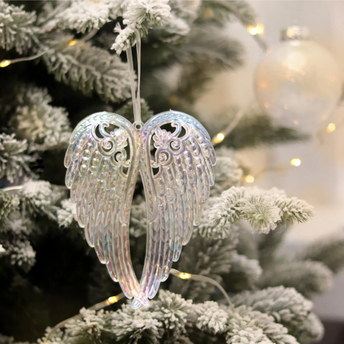 Dekoracyjna zawieszka w kształcie skrzydeł o wymiarach 15x11cm. Przeźroczyste, nietłukące skrzydła z opalizującym wykończeniem. Wykonana w całości z akrylu ozdoba do zawieszania, pięknie odbija światło. Idealnie nadaje się na samodzielną dekorację drzewka lub okna oraz jako dodatek przy pakowaniu prezentów czy tworzeniu stroików i wianków. Dekoracja posiada białą tasiemkę umożliwiającą zawieszanie.