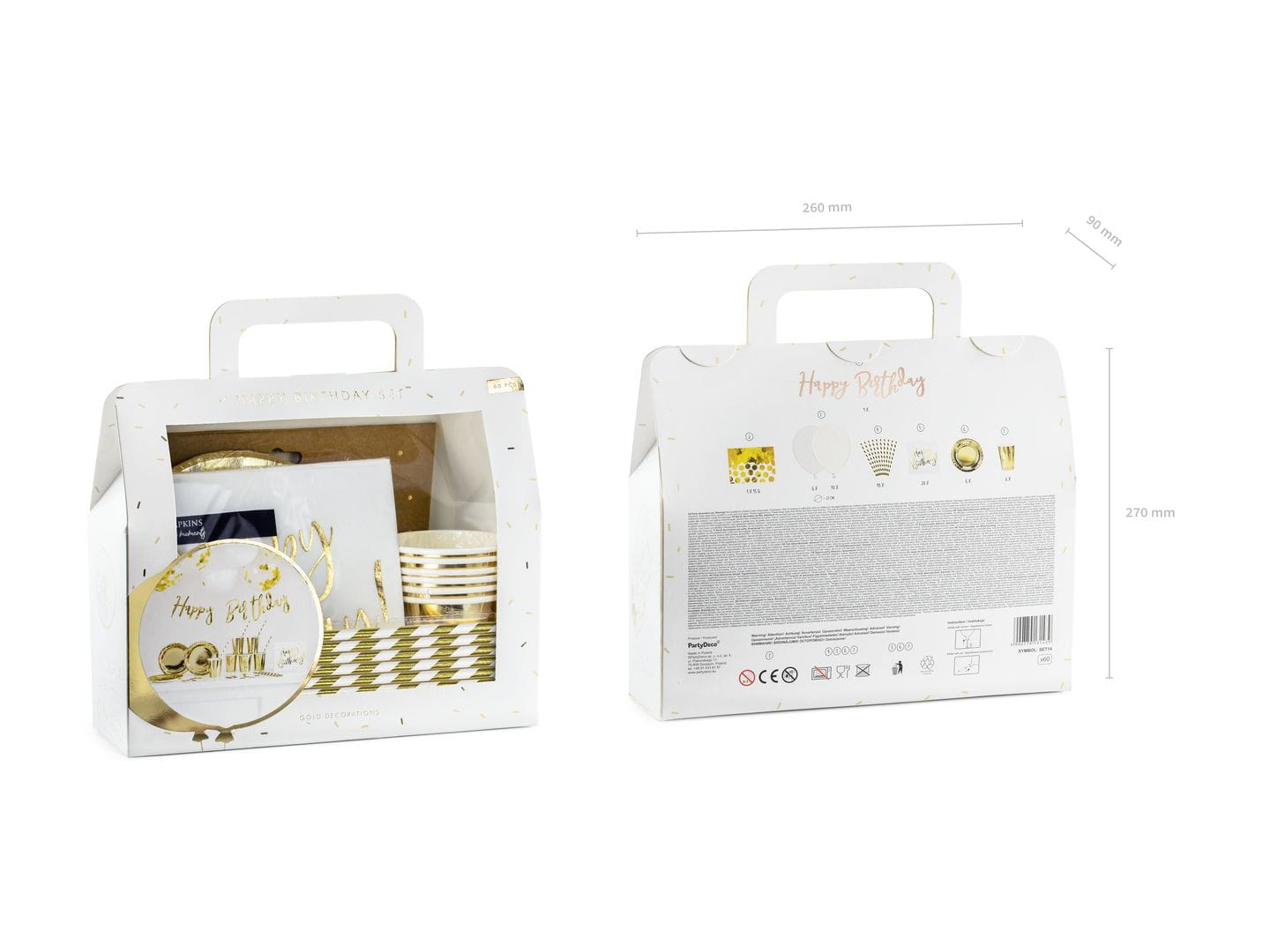Zestaw dekoracji urodzinowych, składający się z 60 elementów. Wszystko zostało tak skomponowane aby tworzyć harmonijną całość. Wszystko znajduje się w wygodnym do transportu i estetycznym pudełku. Taki zestaw dekoracji to bez wątpienia ogromne ułatwienie i wygoda dla osoby przygotowującej wnętrze na imprezę. Zestaw jest bardzo uniwersalny a dzięki złotemu kolorowi także elegancki. Doskonale pasuje zarówno na urodziny młodzieży jak i dorosłych osób.