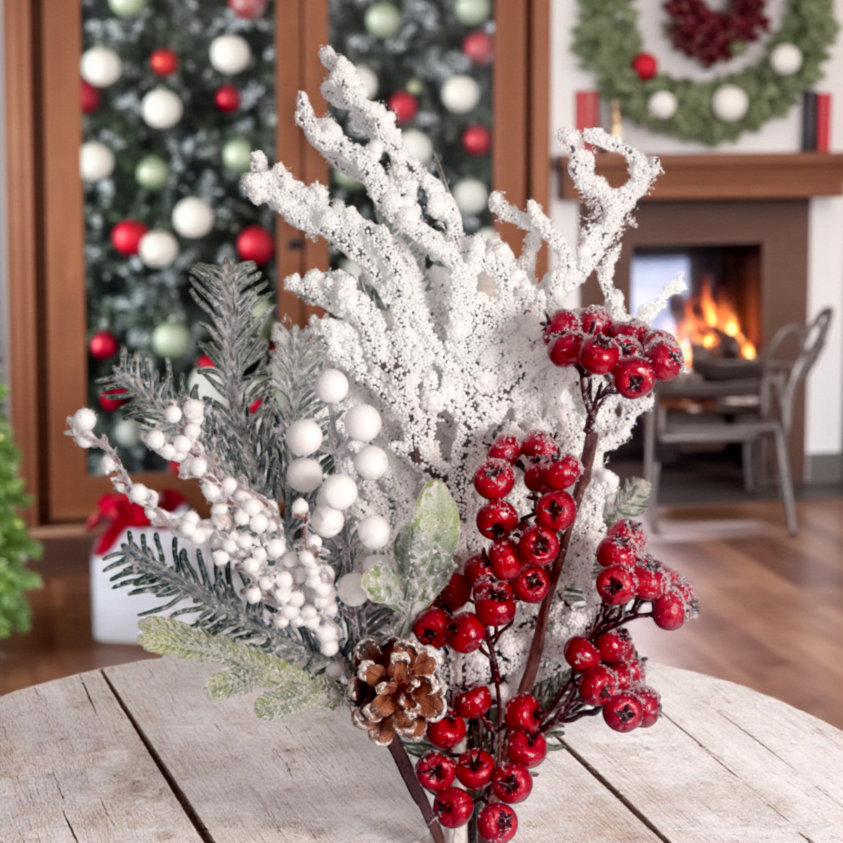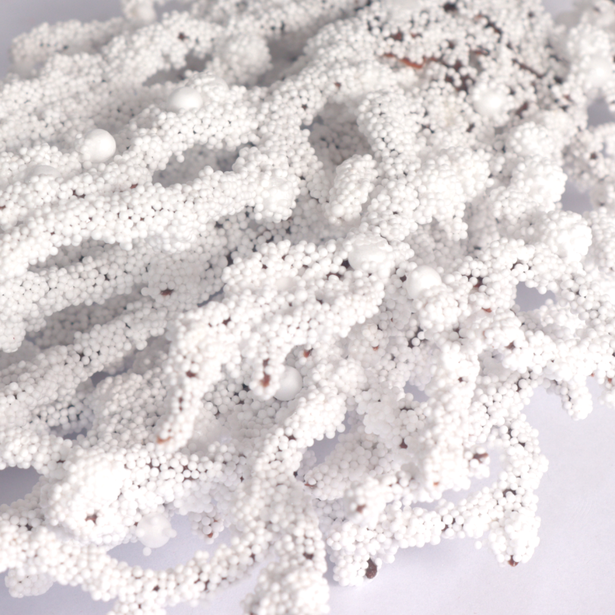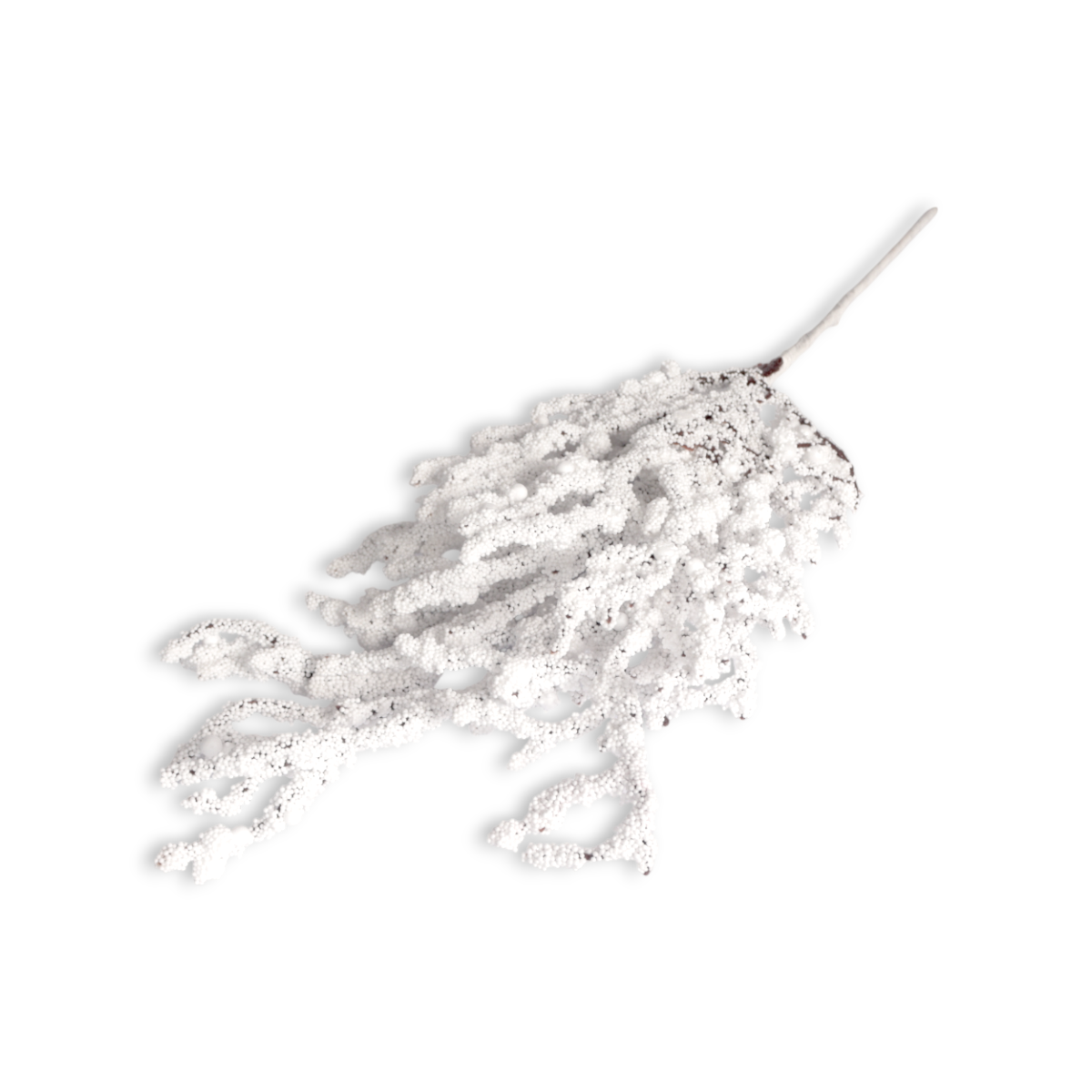 Ośnieżona, zimowa gałązka świąteczna. Gałąź drzewa o długości 55cm, wykonana z elastycznego tworzywa sztucznego, z łatwą do formowania łodygą, wzmocnioną taśmą florystyczną w białym kolorze. Całość jest obficie obsypana bardzo drobnymi białymi kuleczkami, co imituje śnieg. Idealnie nadaje się jako baza do tworzenia świątecznych dekoracji florystycznych. Gałązkę można podzielić na mniejsze i wykorzystać do wianków, stroików lub dekoracji prezentów